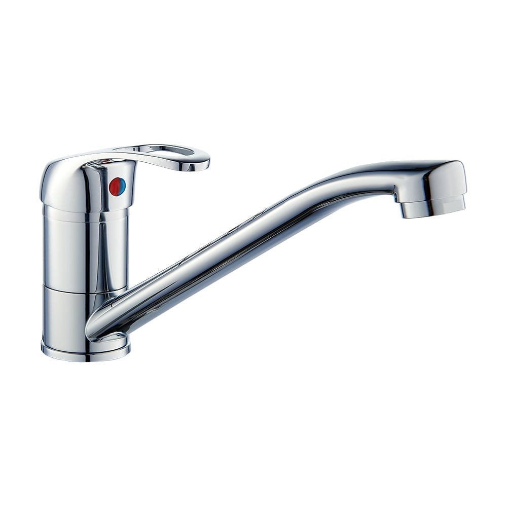 Однозахватный смеситель ROEGEN RB001A для кухни с верхним расположением ручки типа "B" из цинкового сплава и с отверстием на рычаге. Излив длиной 21 см и высотой от аэратора от уровня мойки 10 см уменьшает брызгообразование. Максимальная высота смесителя с опущенный ручкой - 12,5 см. Картридж металлокерамический 35 мм. Крепление к столешнице, мойке или раковине осуществляется с помощью шпильки, фигурной скобы и прокладок. В комплект входит подводка длиной 30 см.