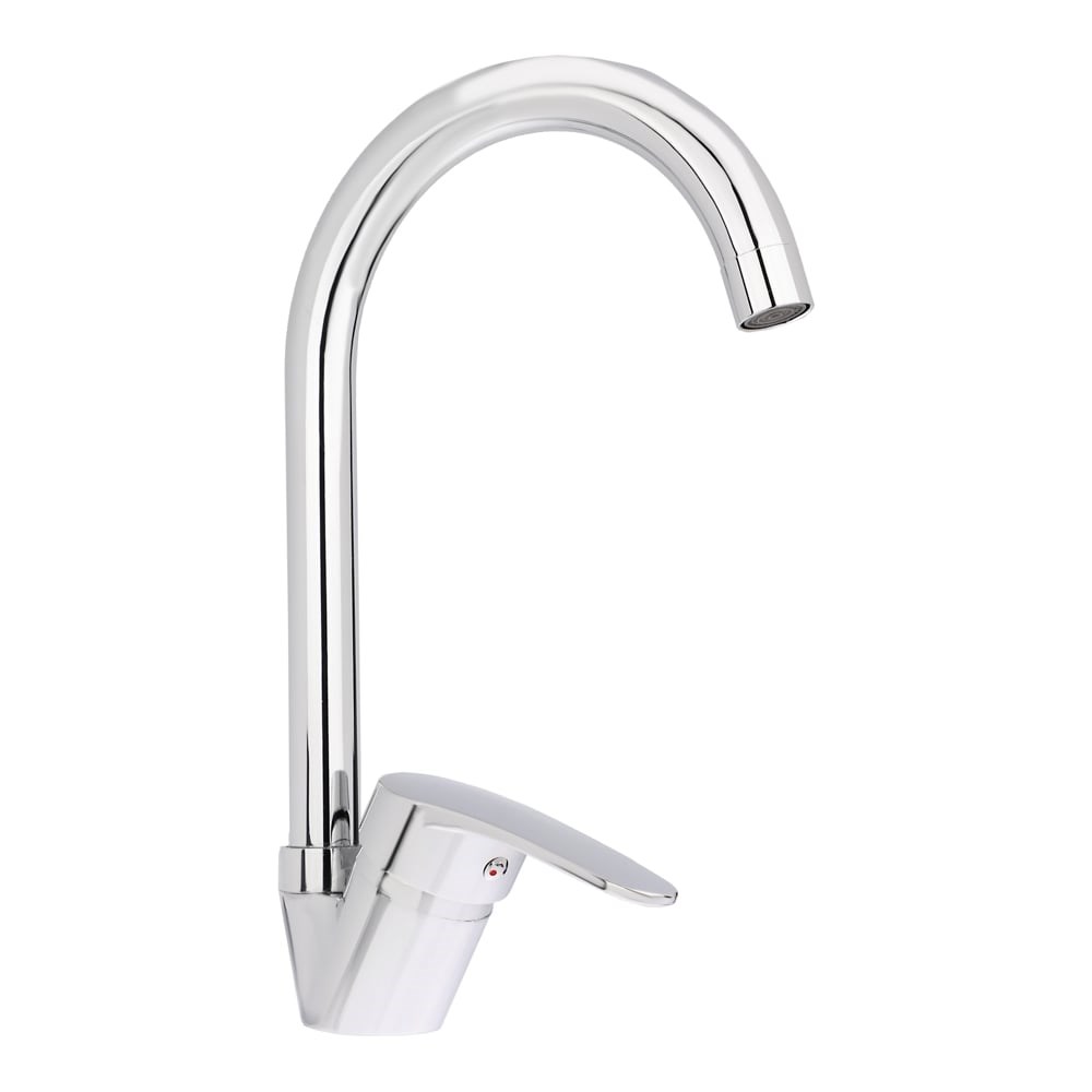 Смеситель для кухни с высоким поворотным изливом - подходит для неглубоких моек (высота излива 25 см). Однорычажный: напор и температуру воды настраивают одной рукой. Керамический картридж 40 мм: большой напор воды - удобно, чтобы быстро наполнить мойку; работает бесшумно; регулирует воду при легком повороте рычага. Крепление на шпильке: подходит для установки на столешницу. Хромированный. Сделан из цинка: служит короткий срок - подходит, как временный смеситель для кухни; портится от резких перепадов температуры воды - меняйте температуру плавно. Как купить: добавьте в корзину и оформите заказ.