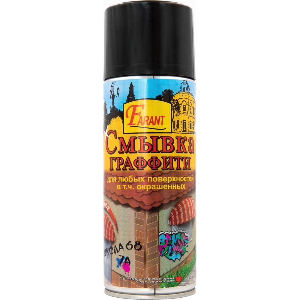 Смывка граффити, маркеров, монтажной пены, клея от скотча Farant 505 мл f12 позволяет смыть следы от граффити, маркера, краски, монтажной пены и т.п. практически с любых поверхностей (металлопрофиль, поликарбонат, керамогранит, фасады зданий, пластик в том числе и окрашенные). Разработан для применения на поверхностях где неэффективно или нельзя использовать растворители. При растворении красок не дает проникать им в пористые структуры кирпича, бетона, фасадов. Эффективен на вертикальных поверхностях за счет гелеобразной структуры. Средство очищает поверхность не повреждая основное покрытие (внимательно изучите инструкцию перед использованием). Способ применения: На финальной стадии добавить воду для деактивации растворителя и получите пенное моющее вещество для чистовой обработки. Перед использованием на деликатных и декорированных поверхностях обязательно проверить действие на небольшом малозаметном участке. Этикетку на баллоне нужно отклеить, чтобы прочитать инструкцию. Смывку нельзя использовать на декорированном пластике(окна под дерево напр.). Причины по которым смывка может не подействовать: Температура ниже 10С. Граффити нанесено обычной краской, а не краской из баллончика. Недодержали и смывка не успела подействовать, или передержали и связующее застыло. Поверхность была влажной.
