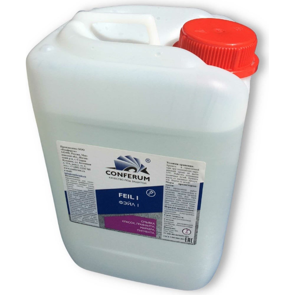 Смывка краски КОНФЕРУМ Фэйл 1 0245/2 предназначена для удаления красок граффити и следов маркера, смывает следы резины, скотча, смывает воднодисперсионные, акриловые, алкидные, масляные краски, мастику с поверхностей фасадов всех типов зданий, сооружений и железобетонных конструкций, мостов и переходов. Удаляет жевательные резинки с асфальта, кафеля. Используется в качестве безопасного растворителя. Порядок использования Перед применением тщательно перемешать Нанесение ровным слоем при помощи кисти, валика Время выдержки от 2 до 20 минут Размягченное покрытие удаляется шпателем, скребком или при помощи аппарата высокого давления Исключить высыхание смывки на обрабатываемой поверхности!