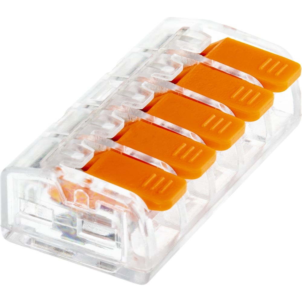 Cоединительные монтажные клеммы duwi СМК 223-415 0,5-4мм2 являются полным аналогом клемм WAGO/ВАГО. Прозрачные 5-х контактные клеммы подходят для соединения моножильных и многожильных проводов, защищая их от повреждения и исключая возможность замыкания. Моножильные провода достаточно только зачистить, а многожильные - нужно обжать наконечником для наилучшего соединения контактов. Рычажки предназначены для надежного зажима кабелей. Клеммы используются в целях переменного и постоянного тока с напряжением до 450В. Номинальный ток: 32 А. Прозрачный корпус позволяет отследить качество соединения. Сечение жесткого проводника от 0,5 до 4мм2. Клеммы duwi выполнены из негорючих материалов - термостойкий пластик, а специальные пазы в корпусе исключают возможность случайного отсоединения проводников. Рабочая температура составляет от -25С до +85С. Набор клемм из 20 штук упакован в пакет с многоразовым замком, который легко открыть и закрыть. Это позволит сохранить порядок при ремонтных работах и при хранении клемм.