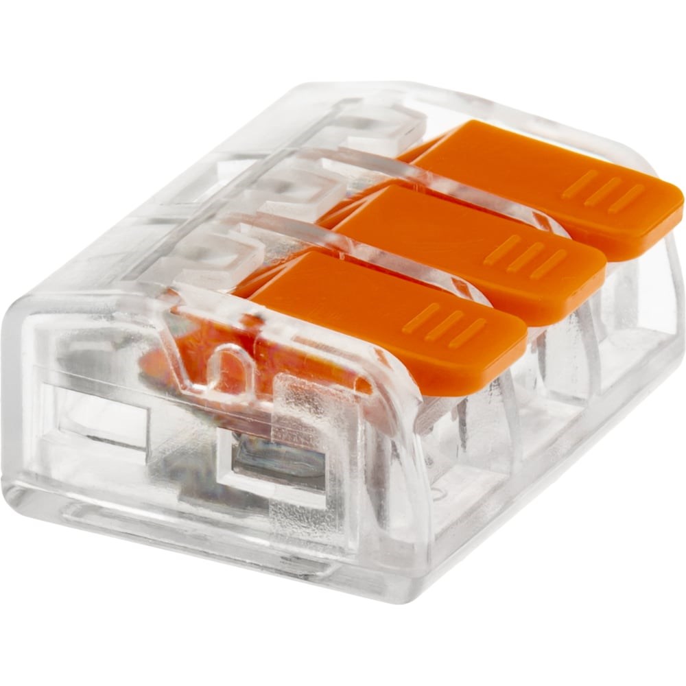Cоединительные монтажные клеммы duwi СМК 223-413, 0,5-4мм2 являются полным аналогом клемм WAGO/ВАГО. Прозрачные 3-х контактные клеммы подходят для соединения моножильных и многожильных проводов, защищая их от повреждения и исключая возможность замыкания. Моножильные провода достаточно только зачистить, а многожильные - нужно обжать наконечником для наилучшего соединения контактов. Рычажки предназначены для надежного зажима кабелей. Клеммы используются в целях переменного и постоянного тока с напряжением до 450В. Номинальный ток: 32 А. Прозрачный корпус позволяет отследить качество соединения. Сечение жесткого проводника 4мм2. Клеммы duwi выполнены из негорючих материалов - термостойкий пластик, а специальные пазы в корпусе исключают возможность случайного отсоединения проводников. Рабочая температура составляет от -25С до +85С. Набор клемм из 5 штук упакован в пакет с многоразовым замком, который легко открыть и закрыть. Это позволит сохранить порядок при ремонтных работах и при хранении клемм.Клеммы обладают следующими ПРЕИМУЩЕСТВАМИ: простое и быстрое подключение, монтаж без инструментов, многократное использование, улучшенная токовая проводимость зажимов, подходят для жесткого и гибкого кабеля, а также для многожильных кабелей.