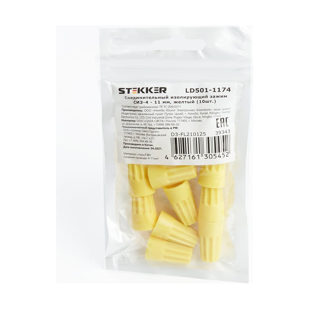 Соединительный изолирующий зажим STEKKER LD501-1174 СИЗ-4 - 11 мм, желтый упаковка 10 шт 39343 - быстрый, легкий и безопасный монтаж. Не требует использования специального инструмента и навинчивается на предварительно зачищенные и скрученные концы проводов. Расположенная внутри корпуса пружина конической формы обеспечивает надежную фиксацию скрутки проводов на протяжении всего срока эксплуатации а корпус полностью изолирует соединение. Зажимы могут быть использованы многократно.