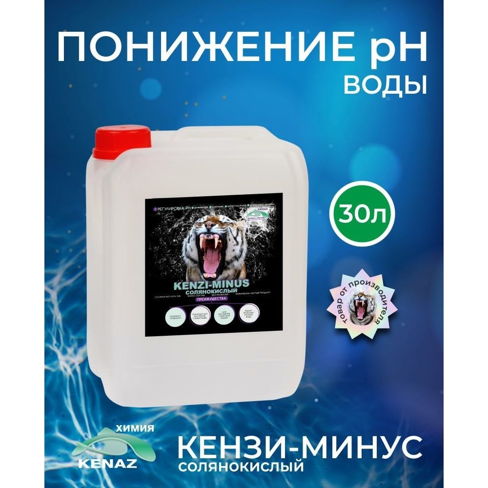 Средство для понижения уровня pH KENAZ КЕНЗИ-МИНУС для бассейна, солянокислый, 30 л 809226 на основе соляной кислоты 14% предназначен для понижения кислотно-щелочного баланса воды в бассейне до оптимального уровня (7.2–7.6). Подходит для понижения ph морской воды и бассейнов с животными. Средство для бассейна восстанавливает железо и решает проблему бурой и ржавой воды. Перед тем как приступить к дезинфекции воды бассейна (борьбой с водорослями, мутью, ржавой водой) необходимо довести показатели уровня рН до нормы). Применяется в грудничковых и общественных бассейнах, джакузи, аквапарках, домашнего использования. Безопасен для детей, животных и беременных женщин, экологичен для воды и почвы. Сертификат эко. Инструкция: KENZI-MINUS добавляется в воду бассейна с помощью автоматических станций или ручным способом. Дозировка для понижения значения рН воды на 0,1 единицу: 0,1 л препарата на 10 м3воды. При ручной дозировке, препарат разведите в чистой пластиковой емкости с водой, понимая, что будет происходить нагревание жидкости, препарат добавляется в воду, а не наоборот. Полученный раствор вылейте по периметру бассейна вдали от форсунок, скиммеров, других элементов оборудования бассейна. Не рекомендуется допускать людей к купанию в течении 30 минут после ручного добавления препарата в воду. Уровень pH влияет на эффективность дезинфектора, количество его использования, а также комфорт людей, которые находятся в бассейне.