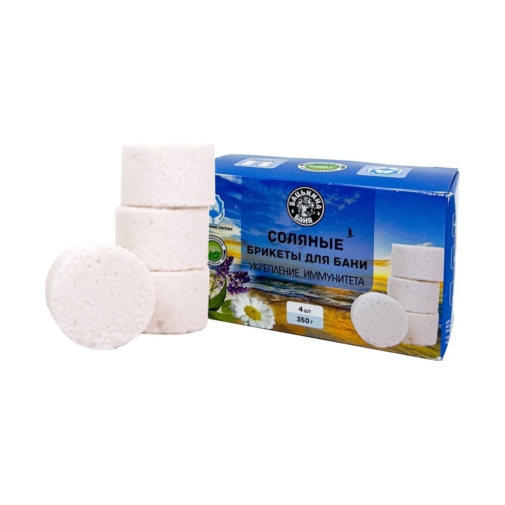Соляные брикеты для бани Бацькина баня Укрепление иммунитета 350 г 23002 - натуральная соль для бани с эфирными маслами эвкалипта, полыни, лаванды, ромашки. Общий вес соли для бани - 350 г. Количество брикетов в упаковке: 4 шт. Соляной брикет для сауны изготовлен из морской природной соли, с полезным комплексом макро- и микроэлементов. Соляные пары улучшают кровообращение. Ионы морской соли проникают в кровеносную систему и ускоряют доставку питательных веществ и кислорода в организме, что приводит к укреплению иммунитета, способствуют очищению дыхательных путей, стимулируют потоотделение, позволяя ускорить процесс вывода токсинов, улучшают состояние кожи и помогают снять стресс и напряжение! Один соляной брикет для бани рассчитан на объем парной: 4-6 м2.