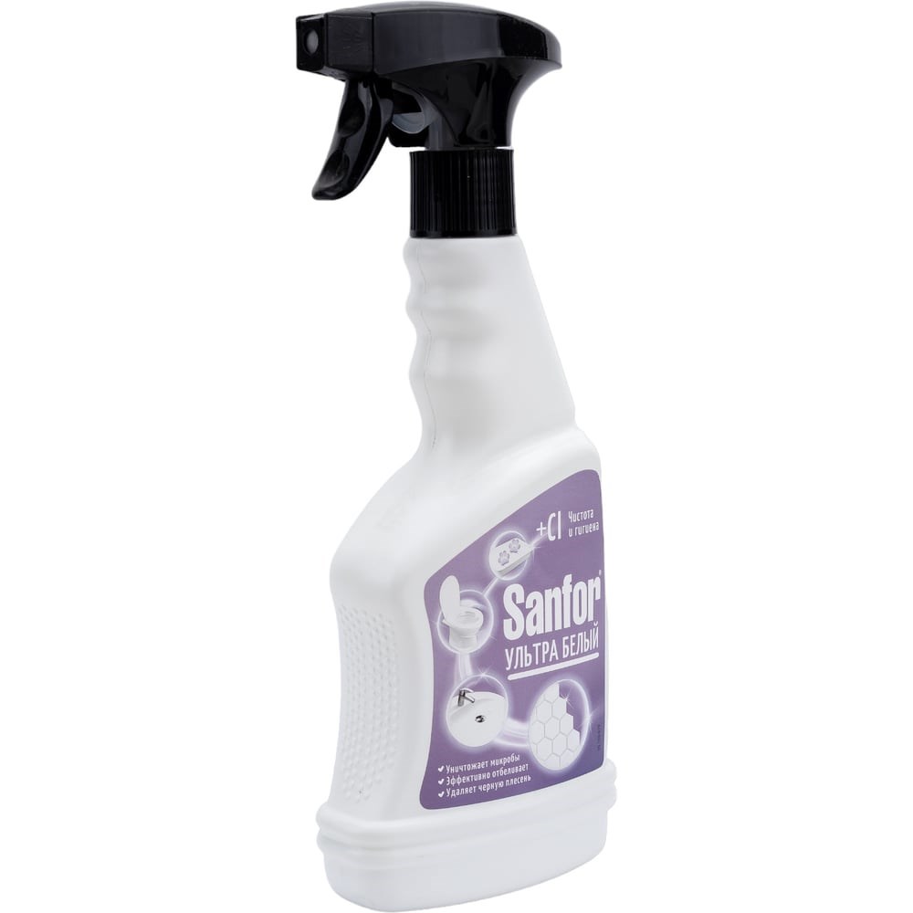 Спрей SANFOR Универсал УЛЬТРА БЕЛЫЙ 500 мл 18396 представляет собой отбеливающий спрей для уборки дома, универсальное чистящее средство для ванной комнаты и туалета. Чистящее средство предназначено для чистки и ухода за раковинами, ваннами, душевыми кабинами, унитазами, керамической плиткой, настенными панелями, моющимися обоями, бытовой техникой. Подходит для уборки туалетов для животных. Спрей обладает антимикробным эффектом и подходит для ежедневного применения. Оставляет после уборки аромат чистоты и свежести. Эффективная формула спрея Sanfor "Ультра Белый" отлично отбеливает и чистит поверхности по всему дому, уничтожает микробы, удаляет плесень, жир, грязь, мыльные потеки, серый налет, пятна различного происхождения, устраняет неприятные запахи. Безопасность, экономичный расход и удобство в использовании обеспечивает удобный мультитриггер спрей-пена с блокиратором.
