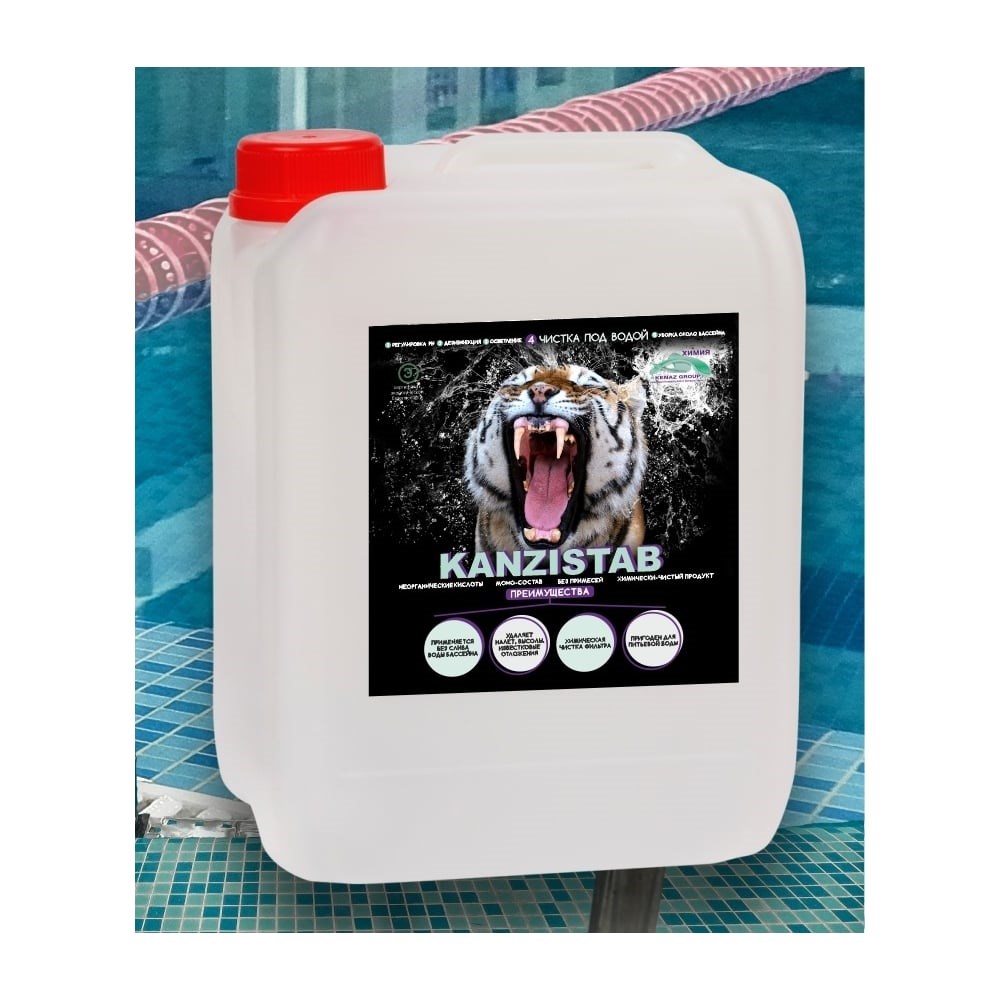 Средство для бассейна KENAZ КАНЗИСТАБ без слива воды, уборка бассейна от налета, известковых отложений, чистка фильтра, 10 л 809424 быстро и эффективно удалит налет, высолы и известковые отложения. Поможет отказаться от использования хлора и постоянной замены воды. Подходит для химической чистки фильтра с песком или стеклом. Пригоден для питьевой воды. Применяется в грудничковых и общественных бассейнах, джакузи, аквапарках, домашнего использования (дачных бассейнов). Не изменяет физико-химические параметры воды, не понижает и не повышает уровень pH воды. Имеет моно состав. Без примесей, стабилизаторов и воды в составе. Безопасен для детей, животных и беременных женщин, экологичен для воды и почвы Инструкция по применению: Для удаления известковых отложений: Нанести в небольшом количестве на загрязнения и оставить (от 20 минут); Не допускать высыхания, смывать водой; Расход 100-200 мл на 1м. Для чистки фильтра: Отключить фильтр от питания; Добавить 1 л средства на 100 кг песка; Оставить на 30-40 минут; Подключить фильтр; Осуществить промывку; Очистка фильтра должна производиться с периодичностью не реже 1 раза в 6 месяцев эксплуатации бассейна, при консервации/расконсервации бассейна, при простое фильтра более 5 суток без использования. Химия для бассейна имеет все санитарные документы и сертификат экологической безопасности. С KENAZ КАНЗИСТАБ бассейн будет всегда чистый.