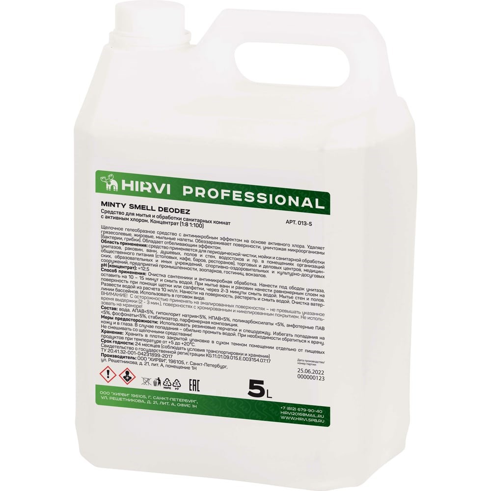 Средство для мытья и обработки санитарных комнат с активным хлором HIRVI Minty Smell Deodez 5 л 331а133 удаляет грязесолевые, жировые, мыльные налёты. Обеззараживает поверхность, уничтожая плесень и микроорганизмы (бактерии, грибки). Обладает отбеливающим эффектом. Подходит для чистки и санитарной обработки унитазов, раковин, ванн, душевых, кухонных плит, полов и стен, водостоков. Применяется для обработки поверхностей керамических, пластиковых, нержавеющей стали, окрашенных деревянных. Может использоваться для отбеливания полов и стен.