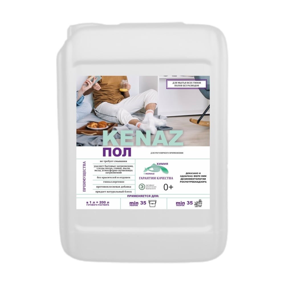 Моющее средство для мытья пола и поверхностей КЕНАЗ жидкость для уборки без разводов, антибактериальное, гипоаллергенное, 5 л 810017 удалит бытовые загрязнения, следы песка, глины, пыли, мела, атмосферно-почвенных загрязнений, кофе, чай и прочее. Жидкость для полов не оставляет разводов, не требует смывания, не разрушает защитный слой поверхности. Придает натуральный блеск. Имеет гипоаллергенный состав, не раздражает кожу рук. Без отдушек и красителей. Безопасно для мытья полов в детских комнатах и учреждениях. Средство для уборки подходит для ламината, линолеума, паркета, наливного пола, пробковых и ПВХ покрытий. Подходит для ежедневной и генеральной уборки.ИнструкцияС использованием роторных машин 200 мл на 75 л воды без последующей промывки.В ручном варианте 10 мл на 1 л воды, не смывать водой.Важно: для чувствительных к воде поверхностям - ограничивать уровень наносимой жидкости или вытирать насухо.Содержит в составе антиплесневый компонент. Имеет сертификат экологической безопасности. В удобном экономичном объеме 5 литров - эффективное жидкое средство для мытья пола на основе биоразлагаемых компонентов. Можно использовать в домах с септиком. С КЕНАЗ белые носки останутся белыми.
