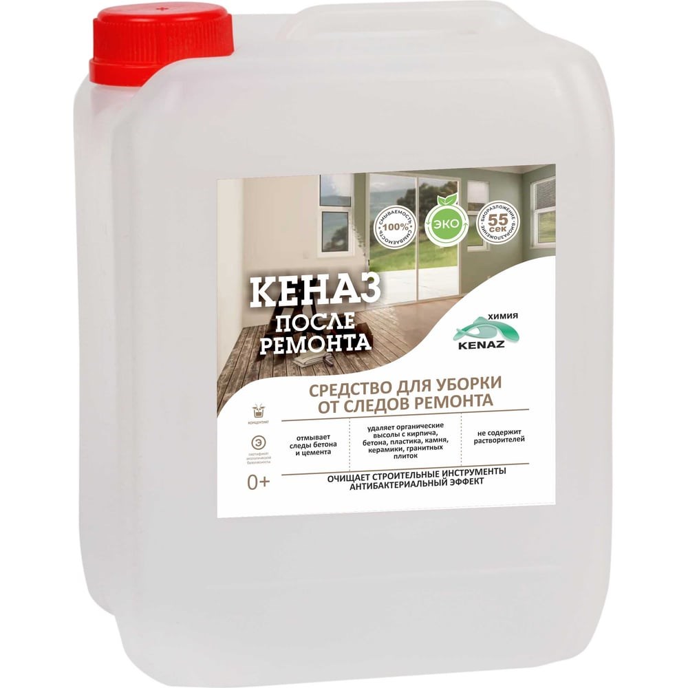 Эффективное не хлорное средство, разработанное для наружной и внутренней уборки от следов ремонта. Оно легко справляется с удалением бетона и цемента, ржавчины, солевых отложений и органических высолов с кислотостойких поверхностей, таких как чугун, фаянс, фарфор, пластик, кирпич, бетон, камень, керамика, а также с поверхностей, покрытых водными и неводными красками.Преимущества:Обладает дезинфицирующим эффектом, что делает его идеальным для поддержания чистоты и гигиеничностиНе размывает затирку, что позволяет безопасно использовать его для уборки после ремонтаПодходит для мытья форм при изготовлении плиткиКЕНАЗ после ремонта полностью смывается, не оставляя следов и разводов, что обеспечивает идеальный внешний вид обработанных поверхностей. Содержит биоразлагаемые компоненты, которые не вредят микрофлоре септических установок.Рекомендуется для применения в:Помещениях с повышенной влажностьюЧастных и общественных помещенияхПредприятиях пищевой промышленностиСпортивных и общественных зданиях и сооружениях, включая дошкольные учреждения, досуга и питания