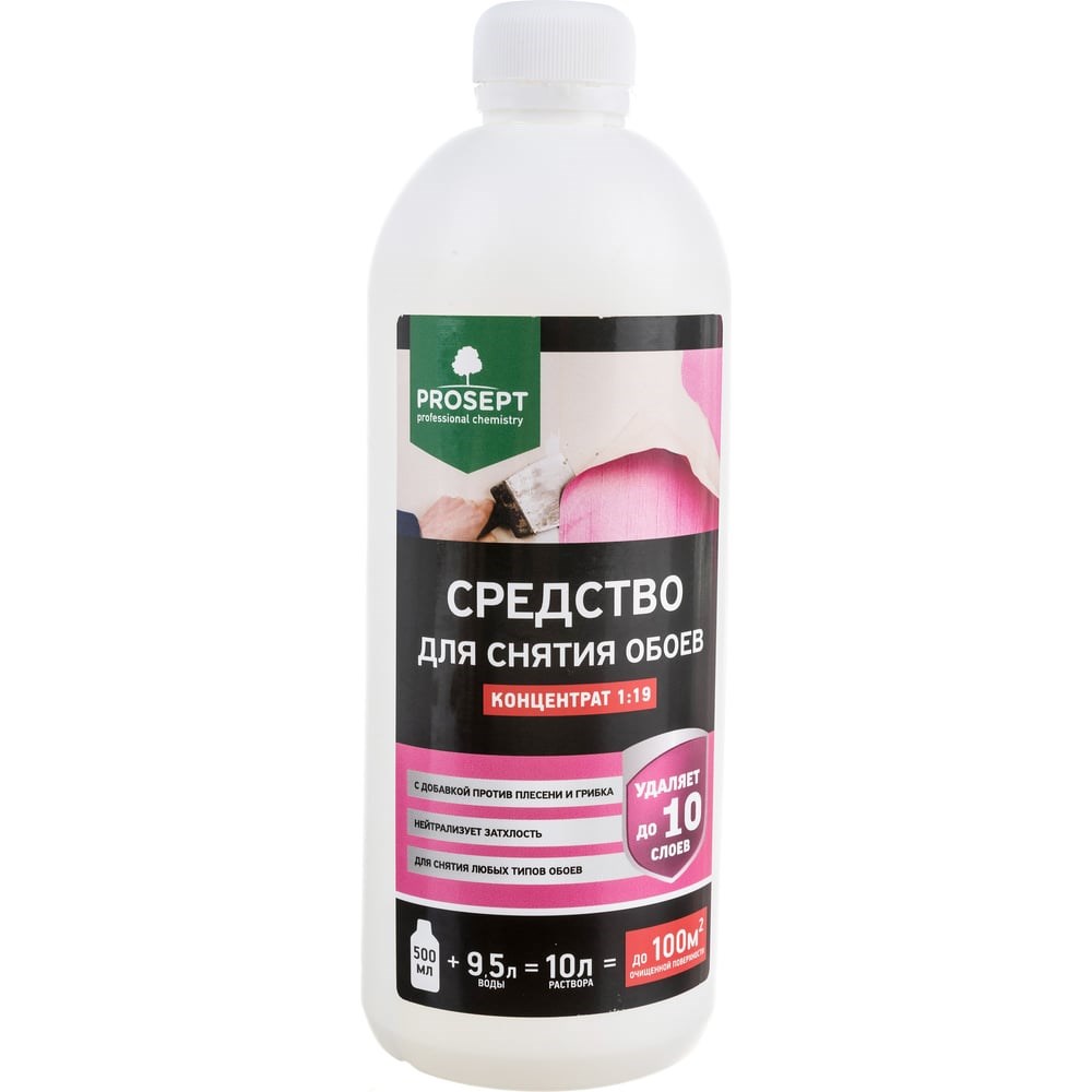 Средство для снятия обоев PROSEPT концентрат 1:19, 500 мл 052-05 подходит для любых типов обоев.Концентрированное средство для снятия обоев предназначено для снятия любых типов обоев. Проникает на глубину до 10 слоев, эффективно растворяет клей, делает старое покрытие мягким и податливым. Обеззараживает стены и предотвращает дальнейшее поражение стен и новых обоев грибками и плесенью. Нейтрализует запах затхлости. Не содержит агрессивные растворители, после использования не требует смывания. ОБЛАСТЬ ПРИМЕНЕНИЯ: для снятия любых типов обоев - бумажных, виниловых, флизелиновых, жидких и пр.Концентрат развести водой (см.ниже). Тщательно перемешать.Невлагостойкие обои: бумажные, акриловые- 0,5л концентрат +9,5 л воды= 100 м2Влагостойкие обои: флизелиновые, виниловые, фотообои- 0,5л концентрат +5 л воды= 55 м2 Перед нанесением состава на виниловые, моющиеся и многослойные обои поверхность обработать металлической щеткой или грубой наждачной бумагой для улучшения проникновения состава. Нанести средство с помощью валика, кисти или разбрызгивающего устройства обильно и равномерно по всей обрабатываемой поверхности. Дать впитаться в зависимости от типа обоев от 3-х до 10-ти минут. Снять обои, используя шпатель или скребок. При необходимости повторить процедуру. РАСХОД: 100-300 г/м2 готового раствора в зависимости от типа и количества слоев обоев.