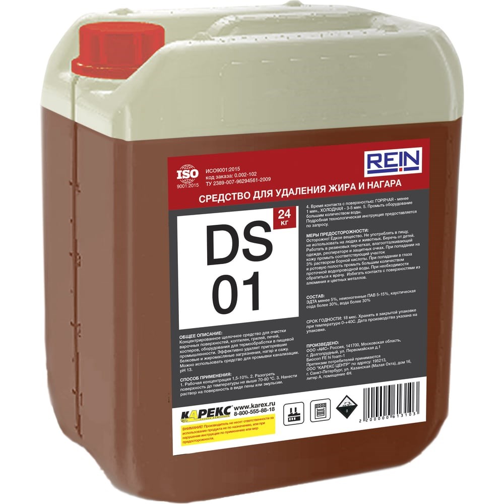 Средство для удаления жира и нагара Rein DS 01 20 л, 24 кг 0.002-102 подходит для чистки поверхностей и оборудования. Хорошо удерживается на вертикальных поверхностях, удаляет застарелые жировые, углеводные и белковые загрязнения, смолы, пригары, копоть, сажу. Легко смывается водой и удаляет неприятные запахи, поэтому облегчает чистку. Экономный расход позволяет пользоваться средством долгое время.