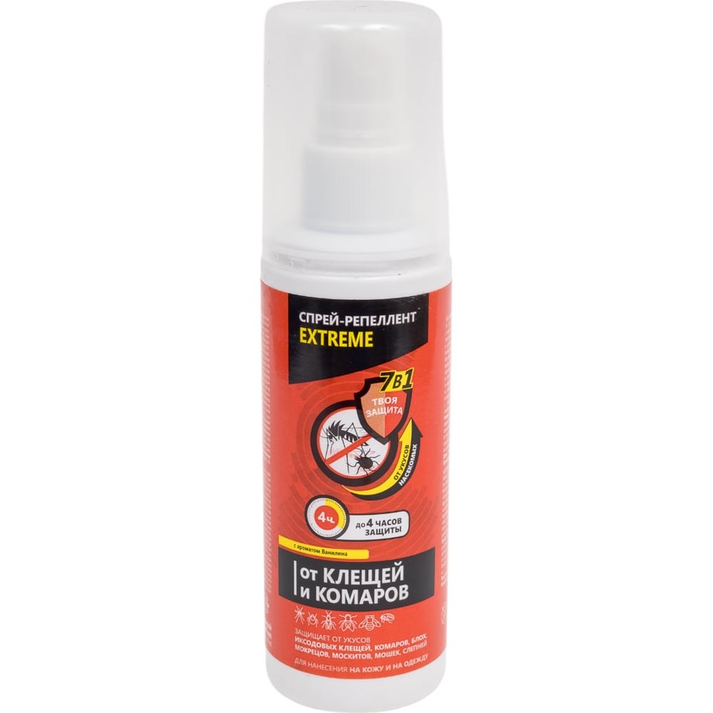 Средство от клещей и комаров ООО Комус Спрей-Репеллент №1 EXTREME 100 мл 1365959 подходит для защиты взрослых людей от нападения кровососущих насекомых (комаров, мокрецов, москитов, мошек, слепней, блох) при нанесении на открытые части тела, одежду и другие изделия из ткани, а также иксодовых клещей (переносчиков возбудителей клещевого энцефалита и боррелиоза) при нанесении на одежду и ;другие изделия из ткани. Время защитного действия: от насекомых при нанесении на кожу - более 4 часов, при нанесении на одежду и другие изделия из ткани - до 30 суток; от клещей при нанесении на одежду - до 5 суток.