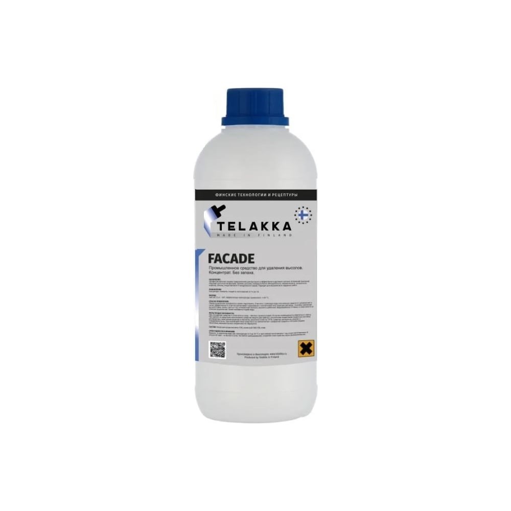 Средство для удаления и очистки фасадов, зданий, цоколей, поверхностей из облицовочного, керамического, силикатного кирпича, бетона, искусственного и натурального камня от высолов от финского производителя TELAKKA FACADE 1л.  Состав предназначен для быстрого и эффективного удаления высолов с различных вертикальных и горизонтальных минеральных поверхностей. Глубоко проникает в поверхность, растворяя и удаляя соли на всей глубине пропитки. Не изменяет свойства и структуру поверхности. Удаляет соли преимущественно карбонатного, известкового и сульфатного происхождения. Без хлора. Подходит для очистки фасадов, зданий, цоколей, поверхностей из облицовочного, керамического, силикатного кирпича, бетона, искусственного и натурального камня.