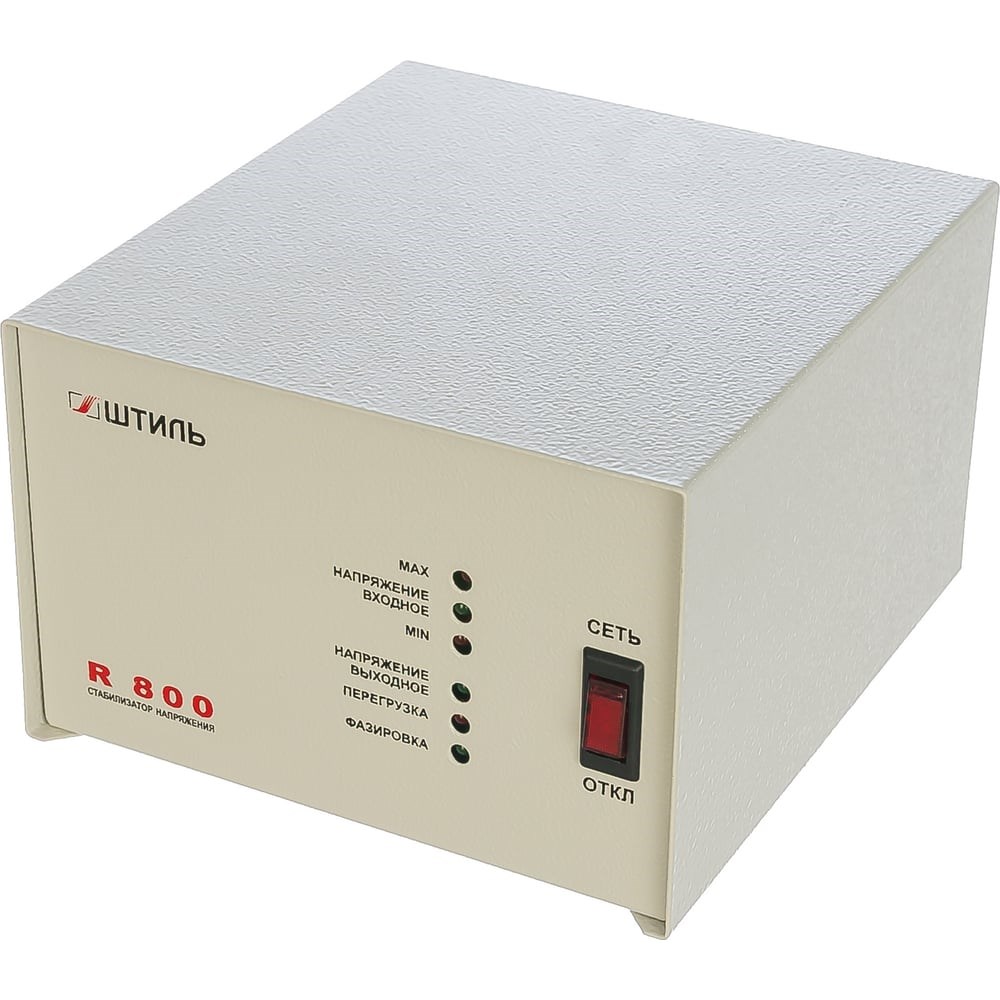 Стабилизатор переменного напряжения Штиль R 800 - устройство для защиты электроприборов от перепадов напряжения и короткого замыкания в местах с плохой проводкой. Суммарная мощность подключаемых приборов не должна превышать 0.8 кВА. Преимуществами прибора являются высокая устойчивость к нагрузкам, большой диапазон входного напряжения и фильтрация на выходе высокочастотных электрических помех. Корпус соотвествует стандарту IP30. Прибор устойчив к воздействиям механического плана.