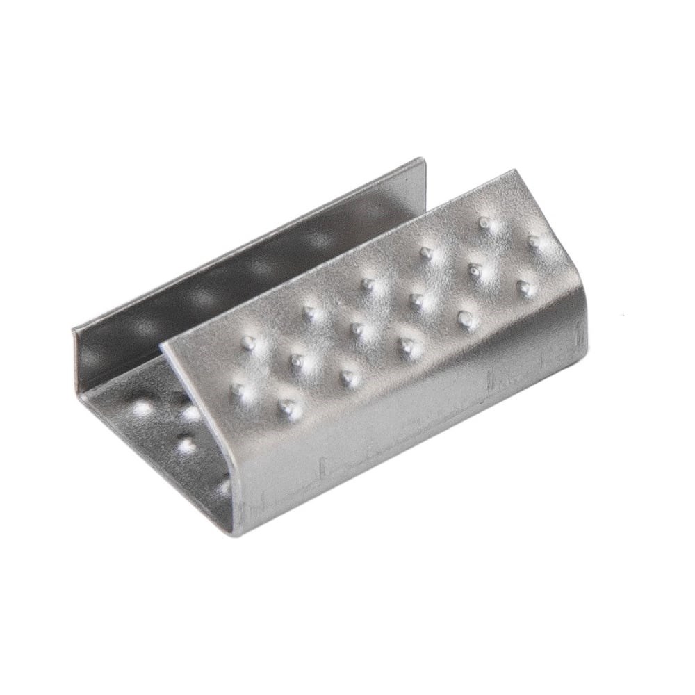 Скрепа применяется для скрепления полипропиленовой ленты шириной 19 мм, обеспечивает одно из самых надежных креплений упаковки. Она изготавливается методом формовки, производится из высокоуглеродистой стали. Строение скобы для стреппинга имеет внутренние выпуклости насечки, которые надежно удерживают ленту в месте скрепления и фиксируют концы ленты, получая надежное соединение. Скоба металлическая применяется для скрепления полипропиленовой ленты шириной 19 мм ручными механизмами, такими как натяжитель с клещами или комбинированным устройством. Стальные скобы одноразовые и реализуются в коробках по 1000 штук в упаковке. Размеры скрепы 27х19х6 мм (планка 12 мм).