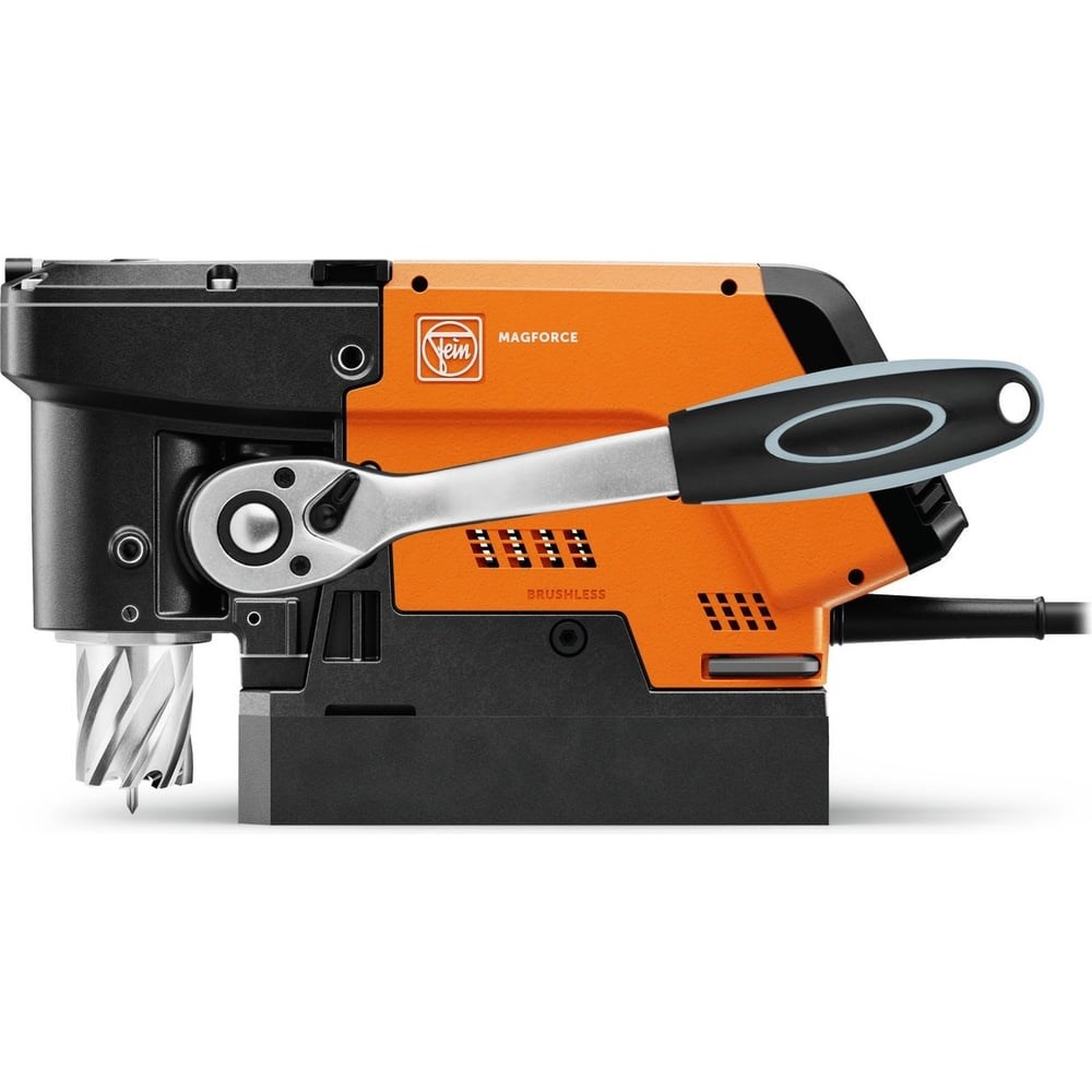 Станок корончатого сверления обладает очень компактной и легкой конструкцией. Применяется для работ в узких и труднодоступных местах, в том числе в вертикальном положении и над головой, благодаря высоте станка 169 мм, конструктивной длине 290 мм и весу 8.5 кг. Очень мощный, не требующий технического обслуживания бесщеточный двигатель на 1200 Вт с высокой стабильной частотой вращения для постоянно высокой скорости резания, а также правого/левого вращения и электронным регулированием скорости вращения подходит для всех сверлильных работ, таких как корончатое, спиральное сверление, нарезание резьбы и зенкование. Удобное управление станком с двух сторон с помощью трещотки. Вал подачи комбинированный: 1/2 дюйма четырехгранник и 8 мм внутренний шестигранник.