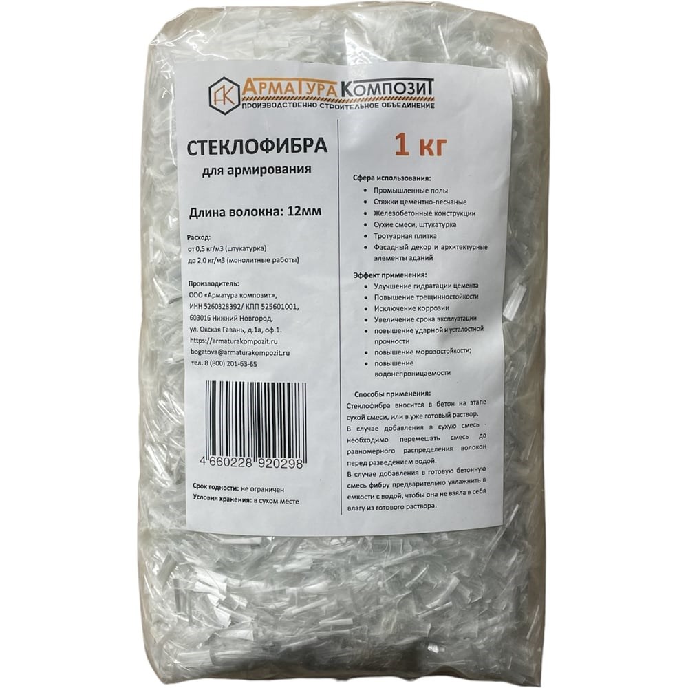 Стеклофибра Арматура Композит 1 кг 4660228920298вносится в бетон на этапе сухой смеси, или в уже готовый раствор.В случае добавления в сухую смесь - необходимо перемешать смесь до равномерного распределения волокон перед разведением водойВ случае добавления в готовую бетонную смесь фибру предварительно увлажнить в емкости с водой, чтобы она не взяла в себя влагу из готового раствораРасход:от 0,5 кг/м3 (штукатурка) до 2,0 кг/м3 (монолитные работы)Сфера использования:Промышленные полыСтяжки цементно-песчаныеЖелезобетонные конструкцииСухие смеси, штукатуркаТротуарная плиткаФасадный декор и архитектурные элементы зданийЭффект применения:Улучшение гидратации цементаПовышение трещиностойкостиИсключение коррозииУвеличение срока эксплуатацииПовышение ударной и усталостной прочностиПовышение морозостойкостиПовышение водонепроницаемостиСтеклофибра изготовлена из стеклоровинга класса E-CR без добавления Бора, что обеспечивает абсолютную стойкость к различным кислотам, высокую стойкость к щелочам.