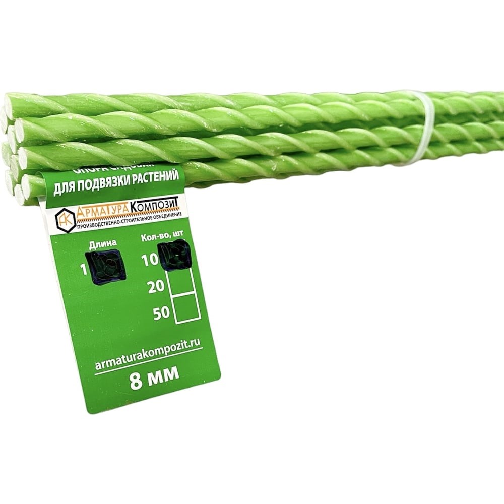 Стеклопластиковая садовая опора Арматура Композит 8 мм, 10 штук по 1 м 4660228920359 предназначена для подвязки садовых растений. Опора защищает стебли растений от поломки при сильном ветре или от тяжести плодов. С их помощью укрепляют травянистые виды культур, у которых образуются крупные цветки и плоды. Согласно правилам комфортного роста и развития растений на каждый саженец или выращиваемый кустик устанавливают индивидуальный колышек. Чтобы правильно привязать саженец любой культуры, нужно использовать веревку либо канатик. Ею привязывают главный стебель к колышку, концы скрещивают либо завязывают восьмеркой.