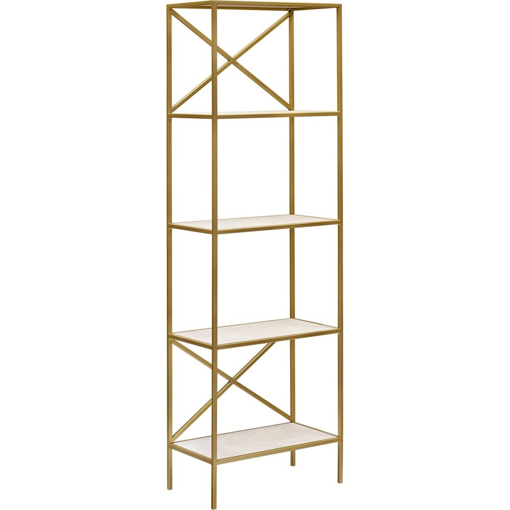 Золотой металлический стеллаж KARIN с полками из керамогранита привлекает внимание элегантным дизайном и функциональностью. Компактный стеллаж организует пространство в гостиной, спальне, кабинете и ванной комнате. Стеллажи KARIN популярны у дизайнеров для создания интерьера в стиле лофт, минимализм и сканди. Каркас стеллажа изготовлен из стальной профильной трубы 20х20 с полимерным покрытием. Полки стеллажа выполнены из керамогранита толщиной 6 мм, выдерживают нагрузку до 10 кг. На открытых полках удобно разместить декор, книги, фотографии и комнатные растения. Стеллаж KARIN создает уникальный дизайн и зонирует пространство. Утонченное сочетание каркаса и керамических полок позволит разместить стеллаж в современном интерьере. Напольный стеллаж не требует дополнительного крепления к стене, устойчив за счет собственного веса. Стеллаж в стиле лофт подойдет для квартиры, загородного дома, офиса и салона. Стеллаж доставляем в собранном виде в надежной упаковке. Коллекция стеллажей KARIN отлично сочетается с пуфами KARIN и консолями TORI. Характеристики стеллажа KARIN: • размеры (длина х ширина х высота): 550х300х1750 мм, • вес – 18,3 кг, • количество полок – 5, • высота полок – 380 мм, • толщина полок – 6 мм, • максимальная нагрузка на полку – 10 кг.