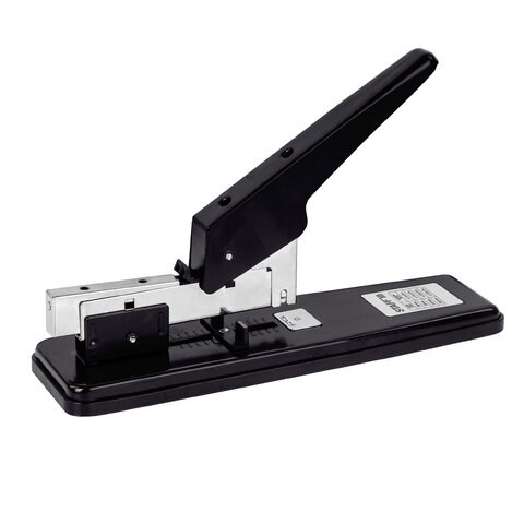 Рабочий механизм и корпус выполнены из металла черного цвета. Способен скрепить до 70 листов бумаги. Подходит для скоб № 24/6, 26/6, № 23/8, 24/8, № 23/10, № 23/13. Глубина закладки бумаги регулируется - до 72 мм. Закрытый вид сшивания. Задняя загрузка скоб.