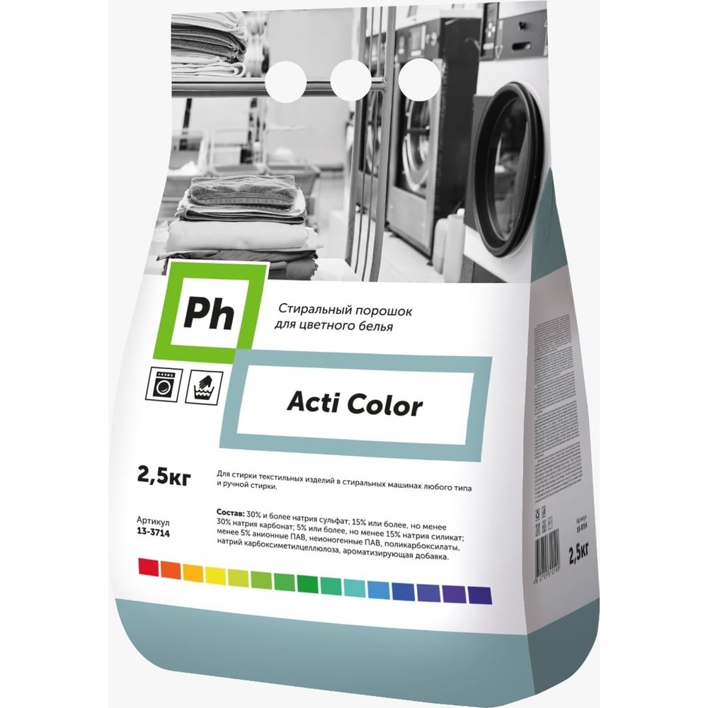 Стиральный порошок для цветного белья Ph Acti Color предназначен для стирки текстильных изделий, расходных материалов для уборки, а также других изделий из хлопчатобумажных, льняных, синтетических и смесовых тканей, в том числе загрязненных биологическими субстратами, остатками пище в стиральных машинах любого типа и ручной стирки. Удаляет органические загрязнения и сложные пятна, сохраняет яркость красок, не повреждает волокна ткани, придает белью свежий аромат. Область применения: На предприятиях индустриальной, фармацевтической, пищевой и перерабатывающей промышленности, общественного питания, торговли, коммунально-бытового обслуживания, химчистках и прачечных, санаторно-курортных, детских, дошкольных, школьных и других образовательных учреждений, общественных зданиях и сооружениях, объектах железнодорожного, воздушного и водного транспорта, населением в быту в стиральных машинах любого типа и ручной стирки. Способ применения: При стирке изделий не превышать температуру, указанную на ярлыках текстильных изделий: 40 °С - синтетические ткани и ткани из смешанных волокон; 60-90 °С - хлопок, лен. В регионах с повышенной жесткостью воды дозировку рекомендуется увеличивать в 1,5 раза. 1 мерный стакан объемом 200 мл вмещает 100 грамм средства.