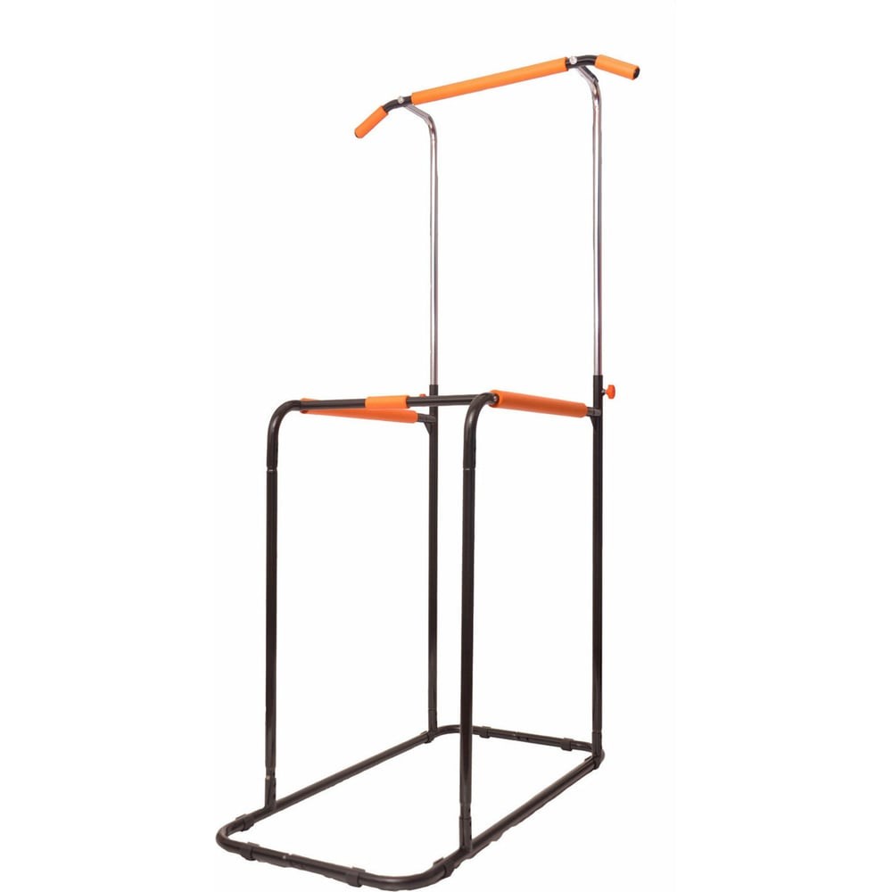 Стойка для подтягиваний и отжиманий DFC Power Tower G006 предназначена для выполнения 3 типов упражнений: подтягивания на турнике, отжимания на брусьях, и прокачки пресса, воздействуя на разные группы мышц тела на одном тренажере. Занятия на этом тренажере способствуют развитию мышц рук, плечевого пояса, спины и пресса. Турник позволяет подтягиваться разным хватом, смещая нагрузку на желаемые участки мышц спины. Он нагружает во время подтягиваний мышцы, расположенные ближе к центру спины Достаточная длина каждой рукояти позволит подобрать ширину комфортного хвата любому атлету, вне зависимости от его антропометрических данных. Он регулируется по высоте от 190 до 218 см, промежуточная фиксация с помощью 2 болтов с ручками. Средний показатель веса, который может выдерживать напольный турник, не должен быть менее 100 кг.