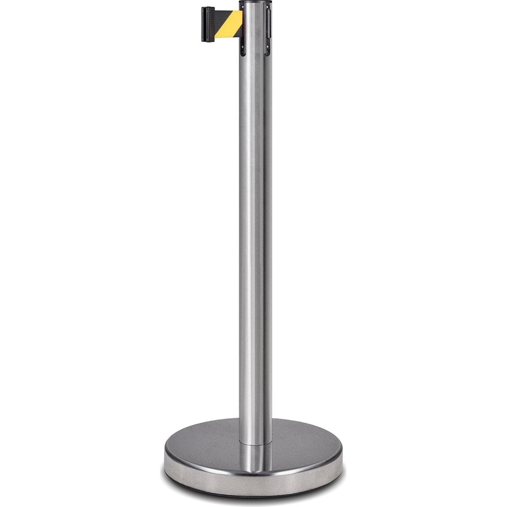 Столбик с вытяжной лентой 5 метров из нержавеющей стали. Состоит из трубы диаметром 76 мм, выполненной из нержавеющей высококачественной полированной стали марки Aisi 201, пластиковой сменной катушки с лентой, дискового основания ограничительного столбика, диаметром 350 мм. Высота стойки 910 мм, диск утяжелитель имеет резиновый кант. Ширина лент 47 мм.