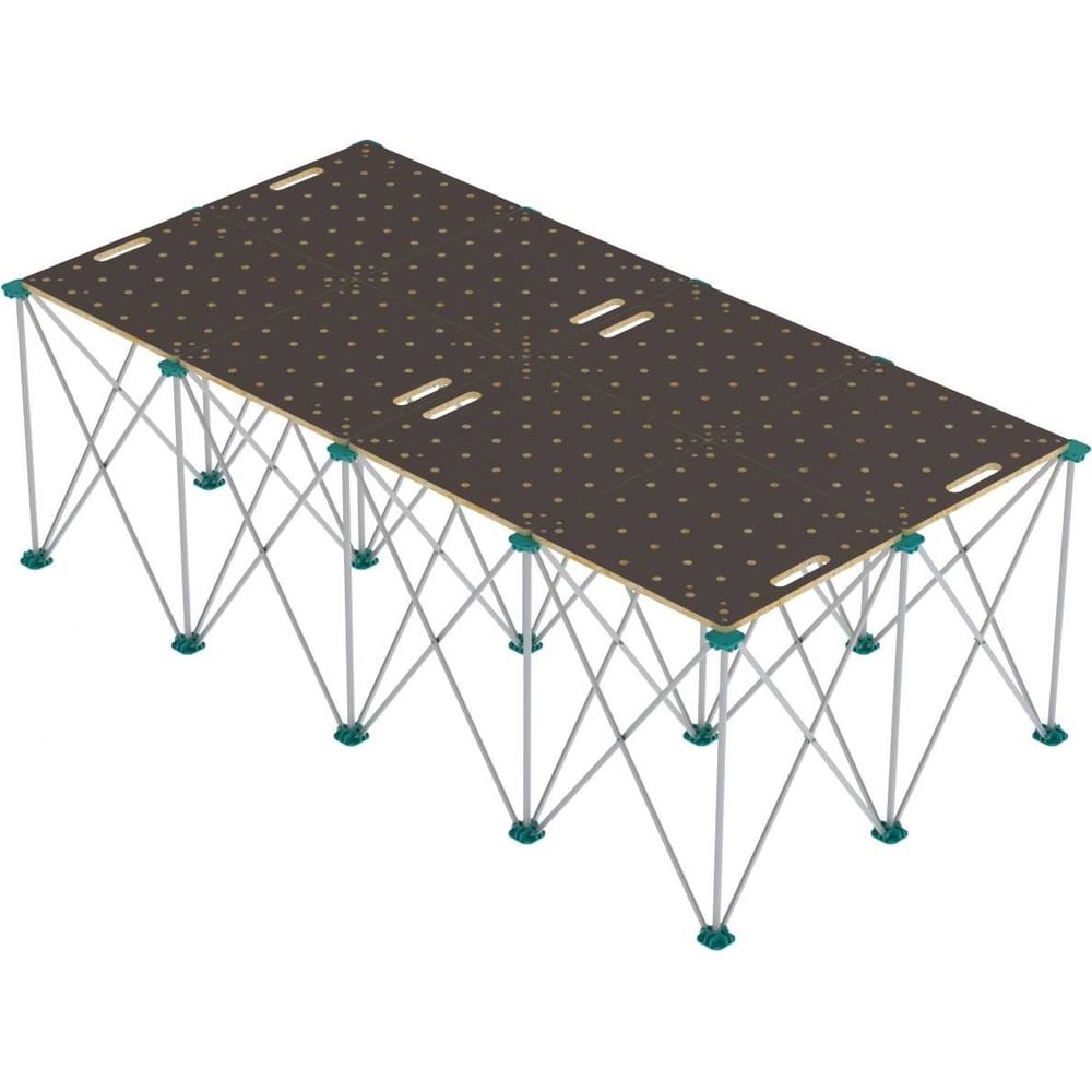 Стол Q4 Ant – это удобная организация рабочего места. Стол Ant используется на строительных объектах и в быту, в гараже и на даче. Может использоваться для выполнения столярных, слесарных, сборочных, раскроечных, малярных, упаковочных и любых других видов работ. Можно использовать как стол - верстак — подмости. Стол имеет комфортную высоту 90см. Состоит из 8 столешниц и подстолья, состоящего из вертикально расположенных опорных стоек, работающих по принципу телескопа. Стойки стола изготовлены из анодированного алюминиевого профиля. Опоры - из полиамида, самого ударопрочного пластика, стойкого к истиранию и позволяющего выдерживать высокую нагрузку. Столешницы - с перфорацией, изготовлены из влагостойкой ламинированной фанеры 18 мм. Диаметр отверстий в столешнице 22 и 20 мм, которые расположены в шахматном порядке.Особенностью стола является его модульность. Конструкция позволяет быстро собирать различные конфигурации повышенной прочности и жёсткости. Одна секция стола 600х600 мм выдерживает равномерную распределенную нагрузку до 300 кг. Рекомендованная нагрузка при конфигурации стола 3х5 - 2400 кг на весь стол.