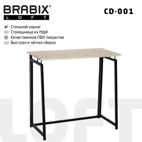 Стол на металлокаркасе BRABIX "LOFT CD-001", 800х440х740 мм, складной, цвет дуб натуральный, 641211