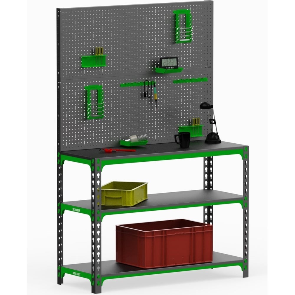 Стол-верстак ООО Металекс 950x1400x600 мм, две полки + двойная перфопанель, с комплектом аксессуаров