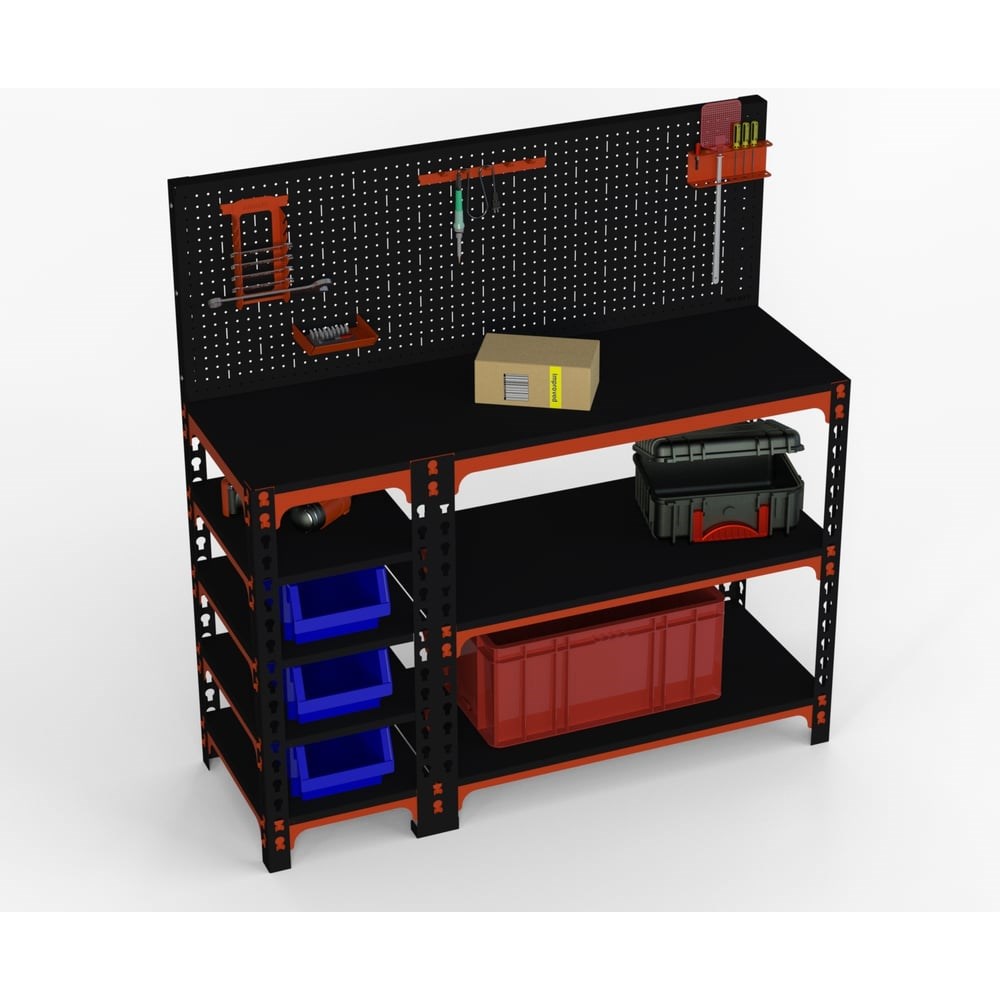 Стол-верстак ООО Металекс 950x1700x500 с бок. полками, перфопанелью и комп. аксессуаров оранжево-чёрный