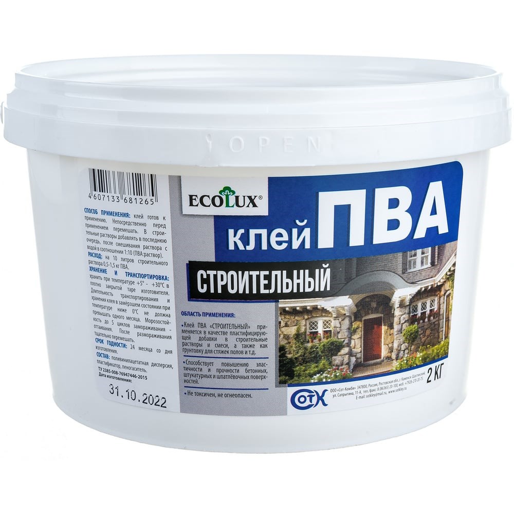 Строительный клей ПВА ECOLUX 2 кг 4607133681265 применяется в качестве пластифицирующей добавки в строительные растворы и смеси, а так же в грунтовку для стяжек полов. Способствует повышению эластичности и прочности бетонных, штукатурных и шпатлёвочных поверхностей. Не токсичен, не огнеопасен. В строительные растворы добавлять в последнюю очередь, после смешивания раствора с водой в соотношении 1:10 (ПВА:раствор).