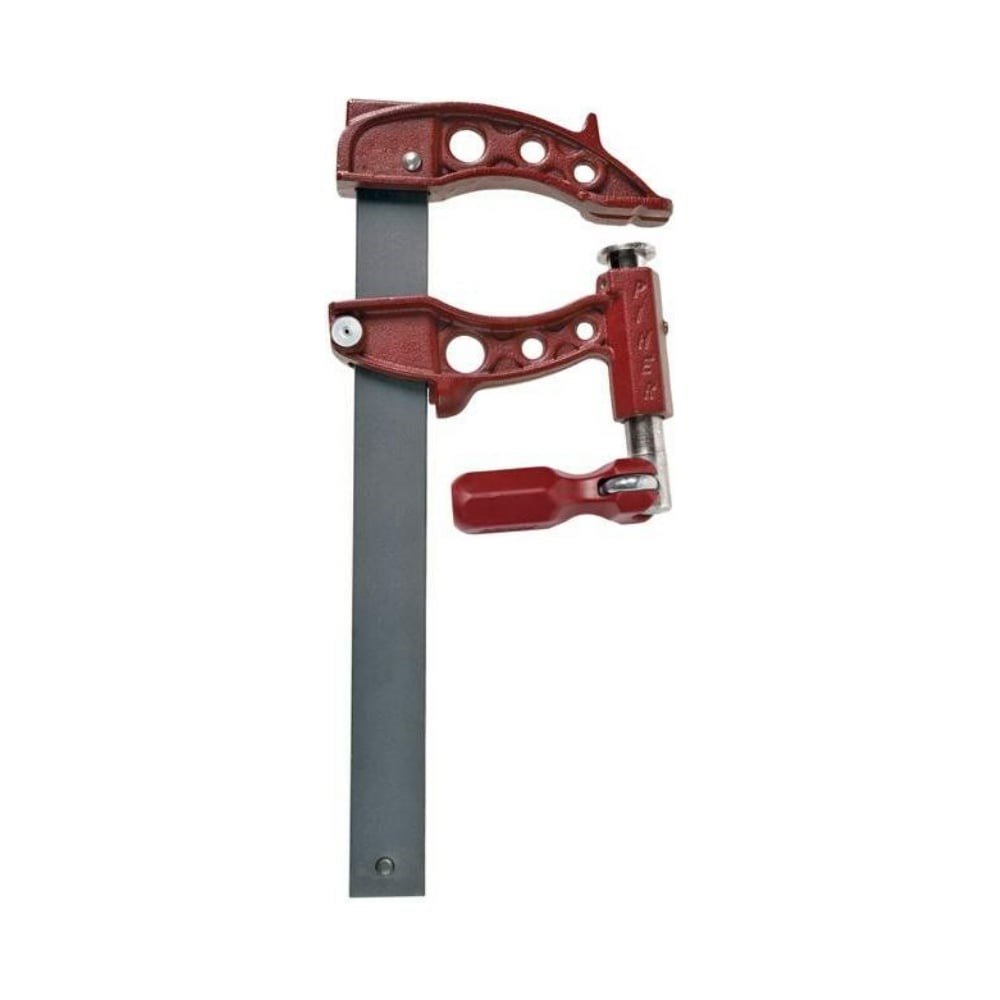 Струбцина Piher Maxi-F 100х12см, 9000N М00005897 обеспечивает быструю и жесткую фиксацию заготовок из металла или дерева. Инструмент F-образной формы отличается высоким уровнем прочности и препятствует смещению детали в процессе работы. Глубина захвата составляет 10 см / 12 см до зажимной площадки / вместе с ней. Челюсть радиальной формы позволяет зажимать детали с усилием 900 кг.