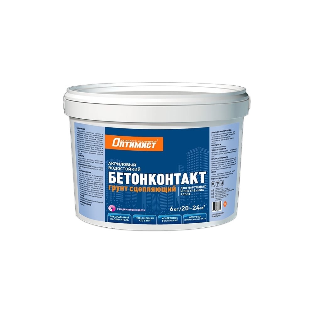 Сцепляющая грунтовка Оптимист Бетонконтакт G109 для наружных и внутренних работ, 6 кг OPG031 предназначена для подготовки основания к последующей отделке (нанесение гипсовых и цементных выравнивающих штукатурок, латексных шпатлевок, клея для плитки). Состав не имеет запаха, не токсичен, экологически безопасен. Дополнительные технические характеристики: Расход 250-300 г/м2. Полное высыхание через 3-4 часа. Температура воздуха и обрабатываемой поверхности от +5°С до +35°С. С кварцевым наполнителем, обладает высокой сцепляющей способностью.