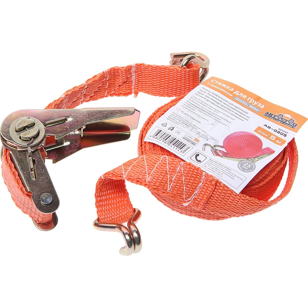 Стяжка для груза с храповиком АВТОСТОП 800кг, лента 5м х 25мм, в пакете AB-0805 изготовлена из износостойкого и малорастяжимого материала. Храповой механизм исключает ослабление натяжения ленты. Прочные крюки обеспечивают надежную фиксацию ремня.