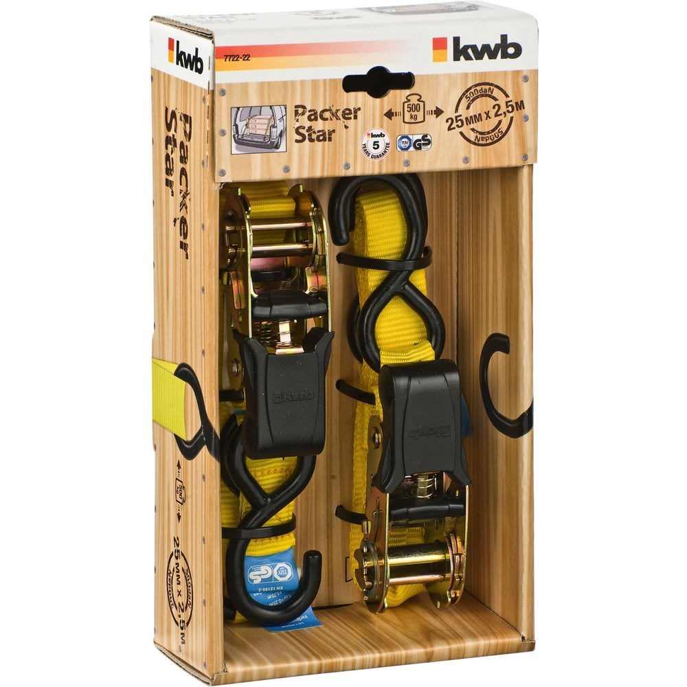 Стяжной ремень с двумя крючками, 2.5м, 2 шт. KWB 7722-22 подходит для средних и тяжелых растягивающих нагрузок: усилие на горизонтальное растяжение - 250 кг, а на обхват - 500 кг. Прочное изделие, представляющее собой полиэстровую ленту с храповиком (имеет пластиковое покрытие, а также механизм разблокировки) и двумя S-крюками, с легкостью поместится в багажнике или бардачке автомобиля. Предназначено для небольших грузов.