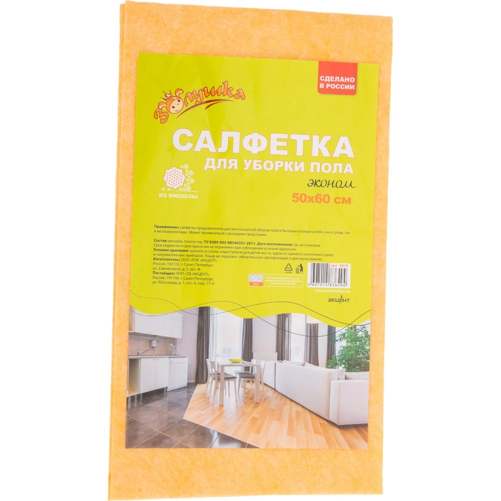 Сухая салфетка для пола из вискозы Золушка Эконом 50х60 см, 1 шт. 4919 - универсальное и экономичное решение для любых типов уборки. Сочетая в себе ключевые преимущества материалов природного и синтетического происхождения, салфетки из вискозы обладают набором свойств, которые определяют их высокую потребительскую ценность. Наряду с длительным сроком службы и износоустойчивостью при сохранении своих первоначальных характеристик, салфетки из вискозы (близкие по свойствам природному хлопку) обладают высокой впитывающей способностью, не подвержены гниению и обеспечивают уборку с минимальным количеством ворса и разводов на поверхности. Подходят для сухой и для влажной уборки. Важным преимуществом является оптимальное сочетание цены и потребительских характеристик изделия.