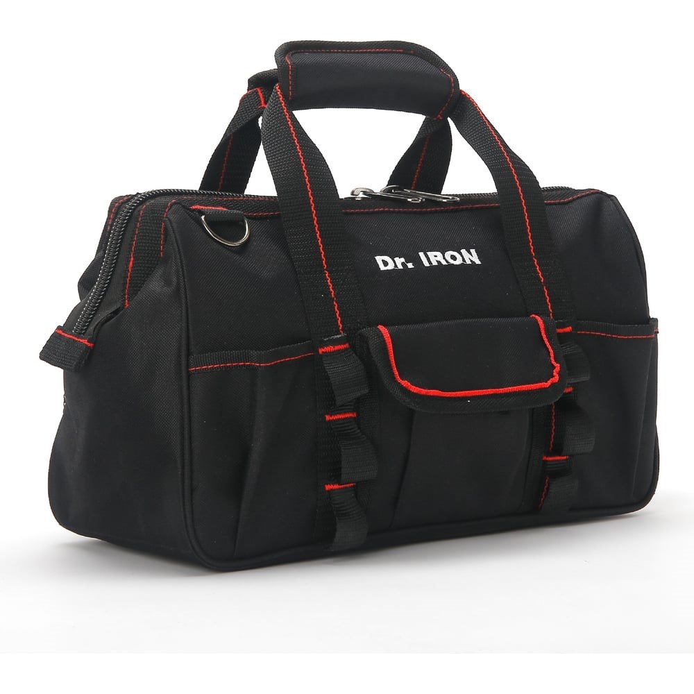 Сумка для инструмента Dr. IRON 360x150x230 мм, с ремнем DR1004 используется для хранения и транспортировки инструмента, различных деталей и крепежа. Экологически чистый безопасный материал сумки не содержит токсичных веществ: фенолов, формальдегидов, тяжелых металлов. С внешней стороны сумки - полиэстер Oxford 600D с ПВХ пропиткой, с внутренней стороны - подкладка из полиэстера. Крупная молния имеет 2 замка. В лицевой части сумки вставлен металлический каркас, который позволяет сумке держать форму в раскрытом состоянии. Сумка оснащена 14 карманами: 6 внешних и 8 внутренних. На ручках сумки предусмотрена мягкая накладка на липучке для комфортного ношения сумки в руках. Сумка укомплектована регулируемым ремнем. В местах наибольшей нагрузки швы усилены.