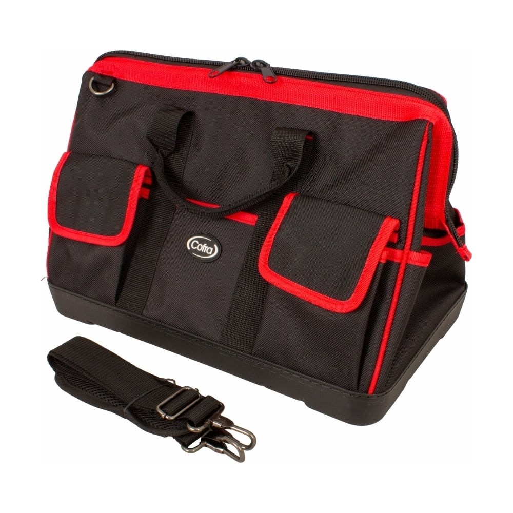 Сумка для инструментов COFRA с пластиковым дном, метал. фурнитура, 450x250x310 мм, цвет красный/черный TC-4221WR представляет собой удобную модель для переноски и хранения инструментов и прочих пренадлежностей. Жесткий каркас из стальной проволокиКарманы - 8 внешних, 10 внутреннихПлечевой ремень, стальные карабины, пластиковые регуляторы ремешков, застежка-молнияТекстильные застежки из нейлонаДно - полипропилен