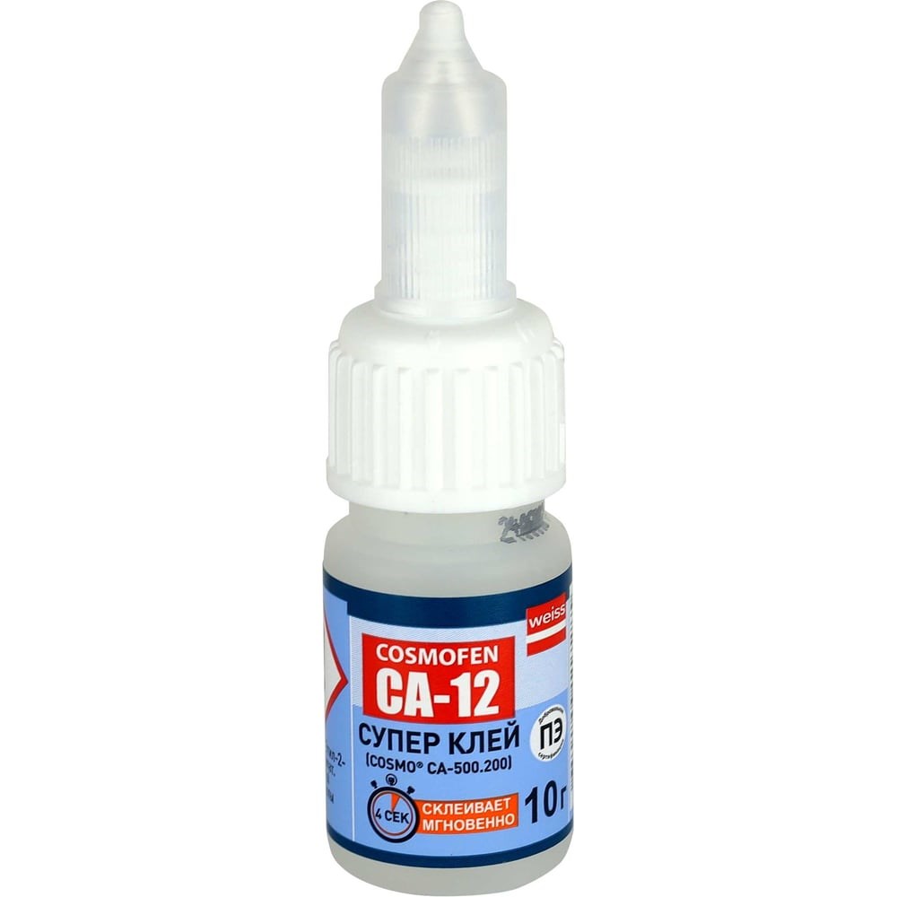 Цианоакрилатный клей COSMOFEN COSMO CA-500.200 - секундный супер-быстрый клей, обладает повышенной прочностью. По результатам испытаний клей Космофен CА-12 признан лучшим "секундным" клеем в области как бытового, так и промышленного применения! Благодаря своим уникальным характеристикам клей Космофен имеет самый широкий спектр областей применения: в быту - прекрасно склеивает все виды пластика, резину, металл, керамику и стекло, незаменим при проведении сантехнических работ, при производстве рекламной продукции, игрушек, в сфере сервисного обслуживания и ремонта автомобилей. Время выдерживания склеиваемых поверхностей составляет считанные секунды. При застывании супер клей момент образует прозрачную пленку, не заметную для глаз. Не использовать клей для склеивания пористых поверхностей. Клей CA-12 очень практичен и легок в применении. СФЕРА ПРИМЕНЕНИЯ: Для склеивания уплотнительных профилей из EPDM и для приклеивания EPDM к профилям из жесткого ПВХ и алюминиевым профилям в оконном производстве. Для склеивания силиконовых уплотнителей и уплотнителей из TPE. Склеивание различных видов пластмасс, эластомеров, резины. Для склеивания полимерных материалов.