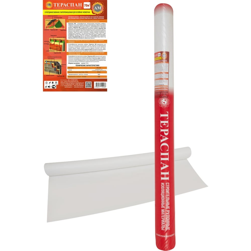 Супердиффузионная, паропроницаемая двухслойная мембрана ТЕРАСПАН AM 70 кв. м 4660077150488 служит для:В конструкции утепленной кровли:Тераспан АМ - применяется в утепленных кровлях с разными типами покрытия,с любым углом наклона и областью применения кровельного материала. Служит для защиты утеплителя и несущих элементов конструкции от подкровельного конденсата, и как дополнительная защита от ветра, снега, а также атмосферной влаги при косом дожде в местах неплотной укладки и дефектов кровли. Способствует выведению влаги из утеплителя. Пароизоляция Тераспан АМ крепится над утеплителем без зазора поверх стропил под обрешеткой.В конструкциях стен зданий с наружным утеплением:Тераспан АМ предназначен для защиты стен малоэтажных зданий из бруса щитовой, каркасной или комбинированной конструкции от воздействия атмосферной влаги и ветра. Во всех случаях применения внешней обшивки (сайдинг, вагонка и т.д.) при наружном утеплении стен. Паропроницаемая мембрана укладывается с внешней стороны утеплителя под обшивкой здания. Способствует выведению влаги из утеплителя.В конструкциях вентилируемых фасадов многоэтажных зданий:Тераспан АМ применим для защиты утеплителя в конструкциях вентилируемых фасадов многоэтажных зданий с наружным утеплением. Предохраняет утеплитель от ветра, атмосферной влаги и снега, проникающего в вентилируемый зазор под внешнюю облицовку.Внимание! Пароизоляция не предназначена в качестве основного или временного кровельного покрытия.