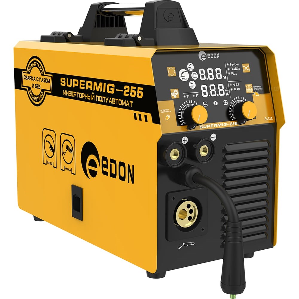 Edon SuperMig-255 Сварочный полуавтомат инверторный 28061 с функцией ручной дуговой сварки предназначен для дуговой сварки MIG-MAG/FCAW высоколегированных сталей плавящейся электродной проволокой размером 0,8-1,0 в среде защитного газа и без защитного газа порошковой (самозащитной) проволокой (с флюсом), также предназначен для ручной дуговой сварки MMA штучными электродами с покрытием всех видов и размеров от 2,0 до 4,0 мм. В данном сварочном полуавтомате предусмотрена функция LIFT TIG - это процесс дуговой сварки, при котором используется дуга, горящая между неплавящимся вольфрамовым электродом и изделием. Также в сварочном полуавтомате предусмотрена функция 2Т/4Т - режим двух- и четырехтактного управления сварочным током и функция SYN - автоматическая настройка сварочного аппарата под заданные параметры. Инверторные сварочные полуавтоматы используются для сварки изделий с повышенными требованиями к внешнему виду и форму шва. Инвертор предназначен для работы от однофазной сети 220В (±15%).
