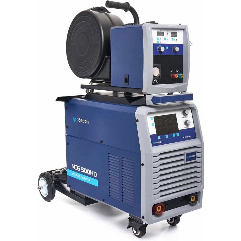 Сварочный аппарат Оберон MIG-500HD предназначен для полуавтоматической сварки MIG/MAG. Представляет собой высокопроизводительное оборудование, способное обеспечить сварку различных материалов больших толщин.Отличительные особенности аппарата:100 % продолжительность включения при максимальном токе способствует повышенной производительности аппарата и позволяет использовать его в промышленности.Модульная конструкция аппарата позволяет объединить все компоненты в один комплект: блок водяного охлаждения (не входит в комплектацию), источник и подающий механизм могут быть установлены друг на друга, что значительно оптимизирует рабочее пространство. Установка всего комплекта на тележку позволит перемещать оборудование в зоне проведения работ.Многофункциональная панель управления оснащена удобным цифровым дисплеем, позволяет с легкостью настраивать силу сварочного тока, сварочного напряжения, скорость подачи проволоки, индуктивности и другие параметры сварочного процесса.Аппарат способен работать в режимах полуавтоматической сварки MIG/MAG, ручной дуговой сварки MMA и аргонодуговой сварки TIG Lift, что делает его универсальным инструментом для различных видов работ.2Т/4Т режимы работы сварочной горелки для сварки коротких или длинных швов.Подающий механизм выносного типа позволяет увеличить производительность и сократить время работы сварщика.Синергетическое управление сварочным процессом. Регулировка параметров сварки в соответствии с различными заготовками и технологией сварки.