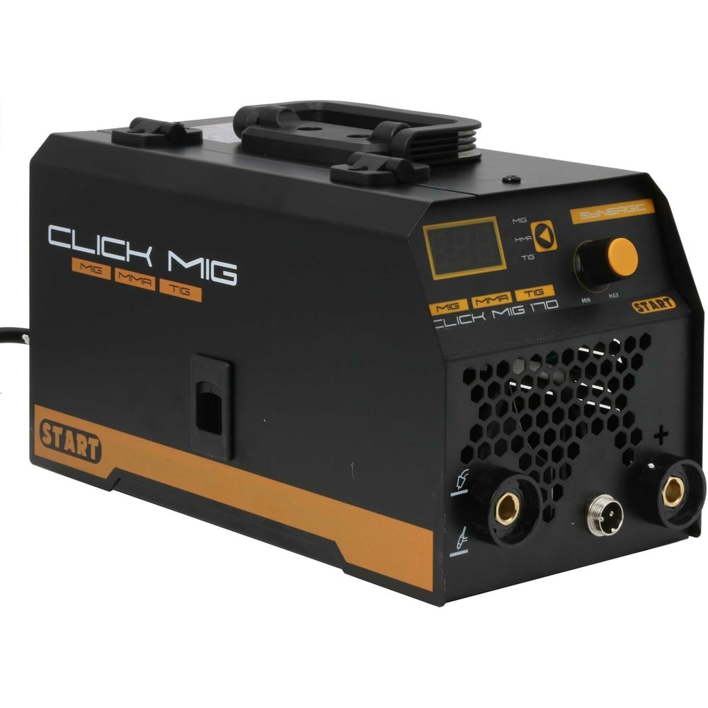 Сварочный полуавтомат Start CLICK MIG 170 2ST172 - универсальный аппарат, который можно использовать для: полуавтоматической сварки порошковой проволокой 0.8-1.0 мм (СВАРКА БЕЗ ГАЗА) ручной дуговой сварки штучным электродом от 1.6 до 4.0 мм аргонодуговой сварки (вентильную горелку необходимо приобретать отдельно)