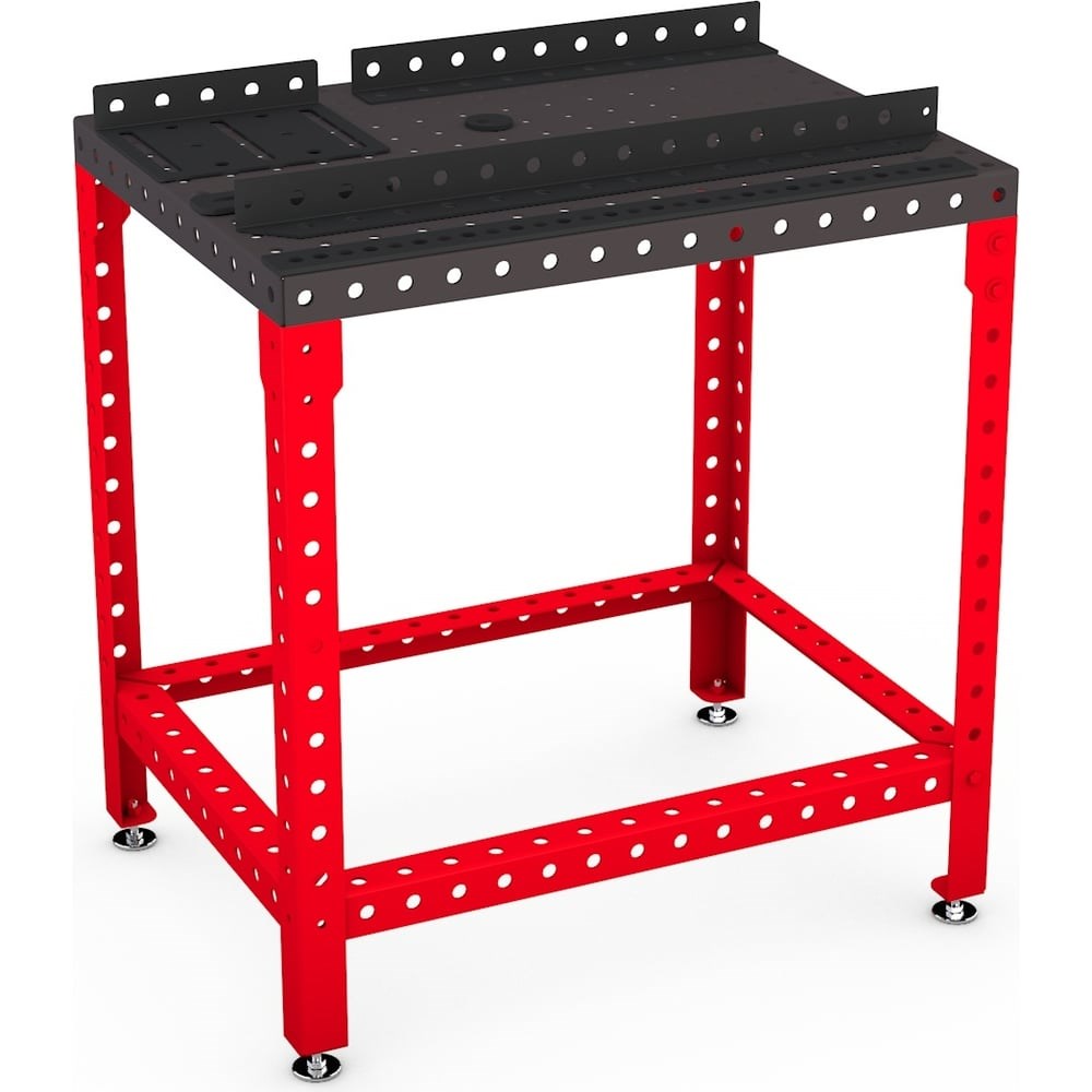 Сварочный стол FLAMES покрытие столешницы - оксидирование 1527.101 удобен и безопасен в работе. Имеет следующие особенности конструкции: Столешница из листового металла толщиной 3 мм, каркас из листового металла толщиной 3 мм. В столешнице отверстия диаметром 16 мм, расположенные с шагом 50 мм. Обработка поверхности столешницы – химическое оксидирование с промасливанием. Стойки и стяжки окрашены порошковой краской RAL 3028 (красный). Регулируемые опоры для неровных полов входят в комплект поставки, диапазон их регулировок 25 мм.