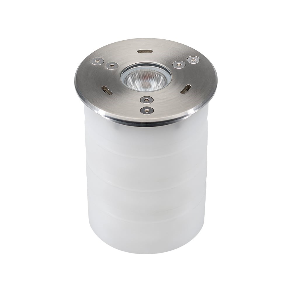 Светильник Arlight KT-AQUA-COLOR-R85-9W RGB 024939 с углом освещения 25°. Световой поток 540лм. Влагозащищенный корпус IP68 - серебристая нержавеющая сталь 316, экран закаленное стекло. Питание DC12В, мощность 9Вт. Размеры DxH Ø84х48мм. Установка в отверстие DxH Ø74х106мм В комплекте 5м провод. Максимальная глубина установки подводой 2м.