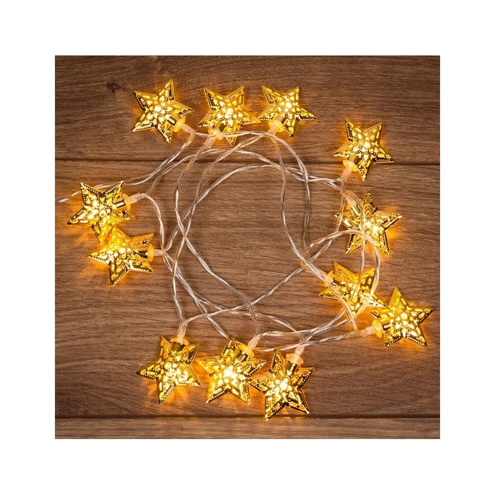 Светодиодная гирлянда «Звезды» питается от солнечной батареи. На проводе, помещенном в прозрачную изоляцию из ПВХ, находятся 12 диодов, которые выполнены в виде ажурных звезд золотистого цвета с глянцевым покрытием. Экономичные безопасные диоды излучают белый свет теплого оттенка. На питающем элементе предусмотрен блок управления с клавишей включения, выключения и смены режима на динамичный — удобное решение, когда гирлянда не используется. Защита IP44 допускает использование на улице.