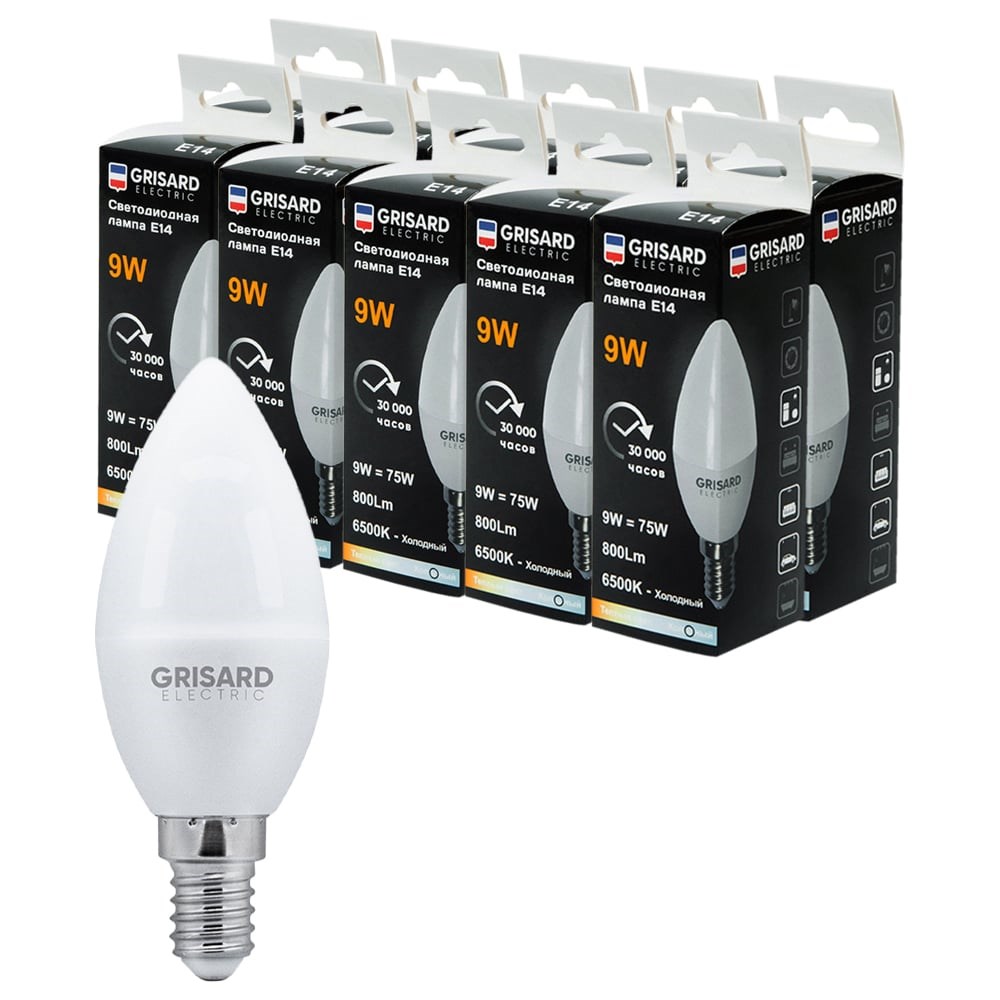 Светодиодная лампа Grisard Electric свеча С35 E14 9Вт 6500K (10 шт/уп) GRE-002-0098 дает свет без мерцания, на протяжении всего срока службы, а работают до 30000 часов, заменяет собой 30 простых или 3 энергосберегающие лампы. За счет низкого нагрева, лампочка применяется даже с натяжными потолками и в качестве подсветки в корпусной мебели или над рабочей зоной. Обеспечивает свет, не раздражающий глаза, а цветовая температура 6500К позволяет установку в офисных или жилых помещениях. Не искажает цвета и дает равномерный свет в 800 Лм, заменяет лампу накаливания в 75 Вт.