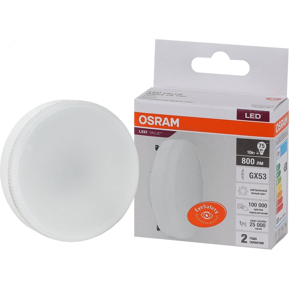 Лампа спот OSRAM серии LED Value с цоколем GX53. Материал колбы - пластик, исполнение - матовое. Световой поток 800 люмен, что соответствует лампе накаливания на 75 Вт. Подобные лампы используются для внутреннего освещения. Напряжение питания 220-240В. Лампа излучает нейтральный белый свет, угол пучка - 110° Срок службы - 25000 часов. Товар сертифицирован.